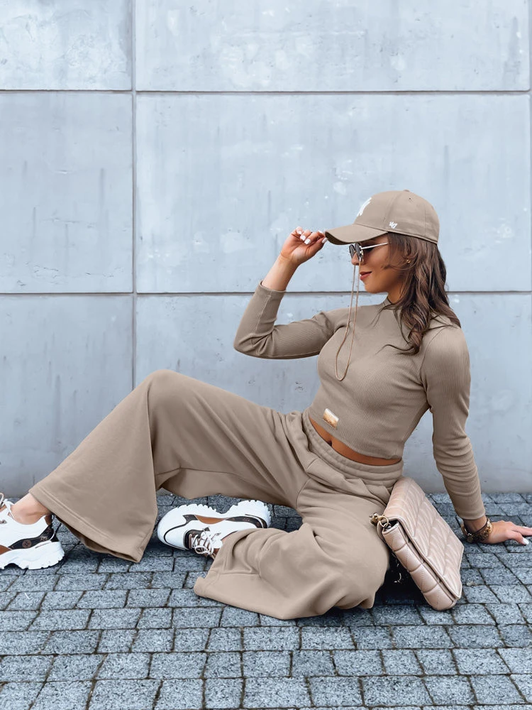 Dámský komplet širokých kalhot a crop topu ASTRAL ALLURE tmavě béžový FashionStreet AY0905