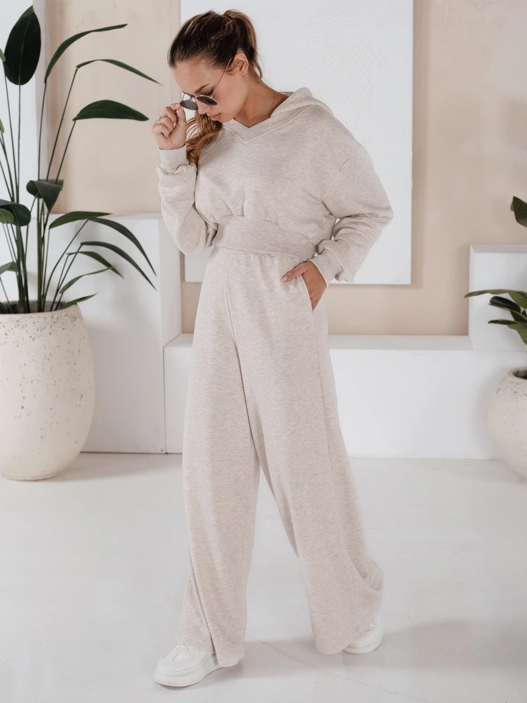 Souprava s nejmódnějšími širokými kalhotami sezóny s vyšším sedem a širokým pasem. Kalhoty mají elastický pas, takže se dokonale přizpůsobí vaší siluetě. Krátká mikina s kapucí dodává celému vzhledu sportovní nádech.