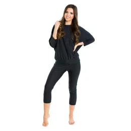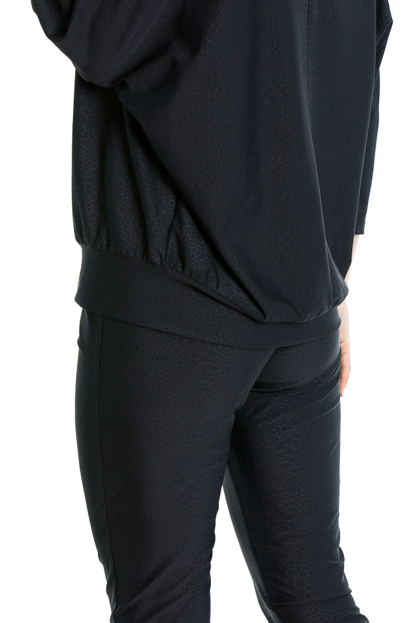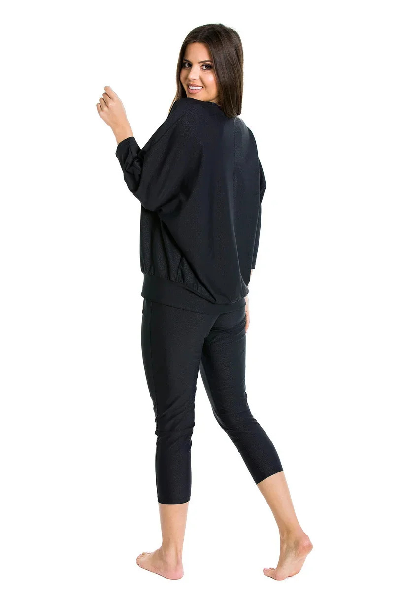 Volná blůza má v pase stahovací lem. Úzké kalhoty mají v pase širokou gumu.
