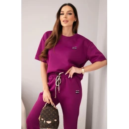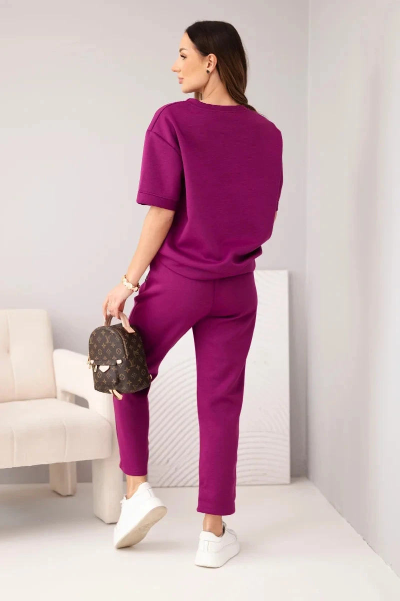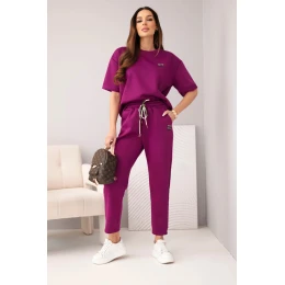 Dámský komplet viskózový máslo s krátkým rukávem a kalhotami s ohrnutým nohavicí tmavě fialový
