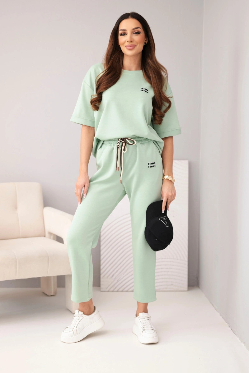 Dámský komplet viskózový máslo s krátkým rukávem a kalhotami s ohrnutým nohavicí tmavě mátový