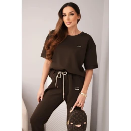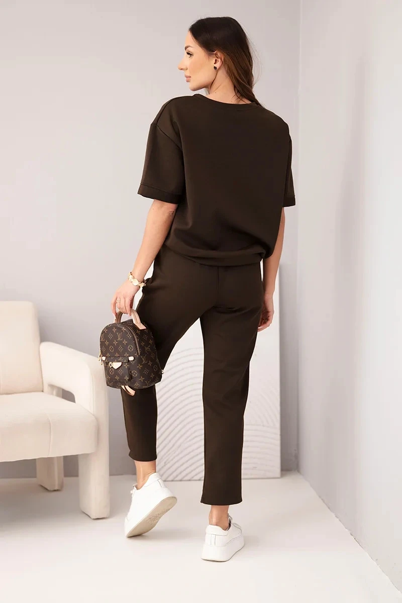 Dámský komplet viskózový s krátkým rukávem a kalhotami s ohrnutými nohavicemi hnědý