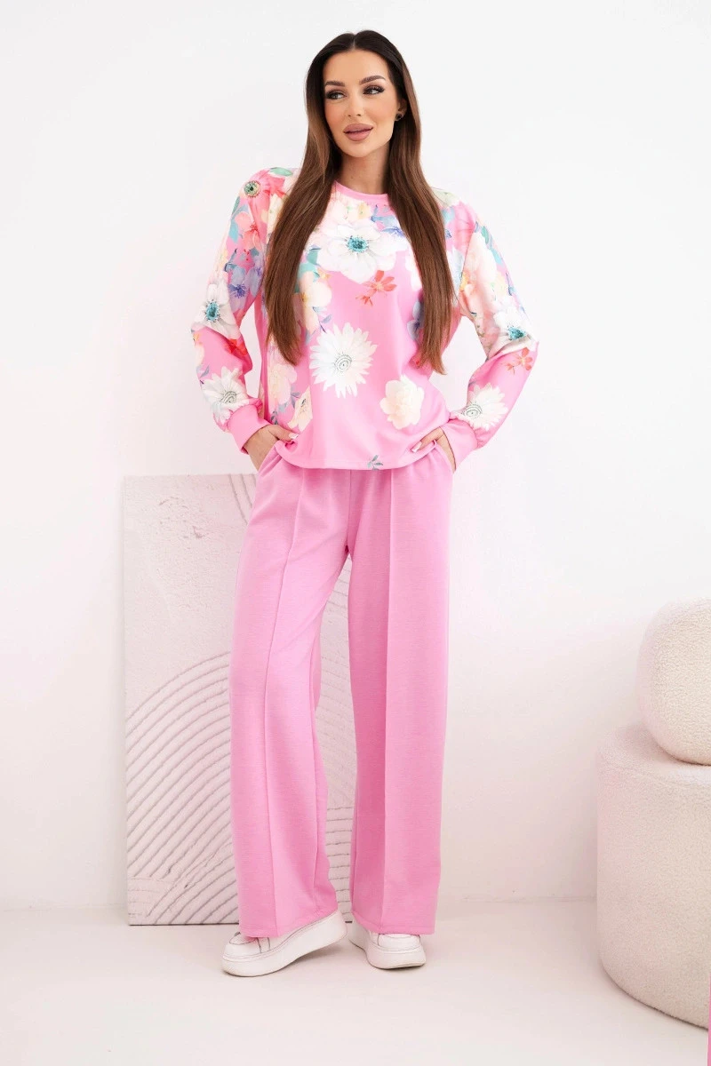 Dámský komplet z máslové viskózy s květinovým vzorem a širokými nohavicemi světle růžový