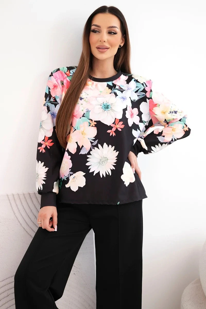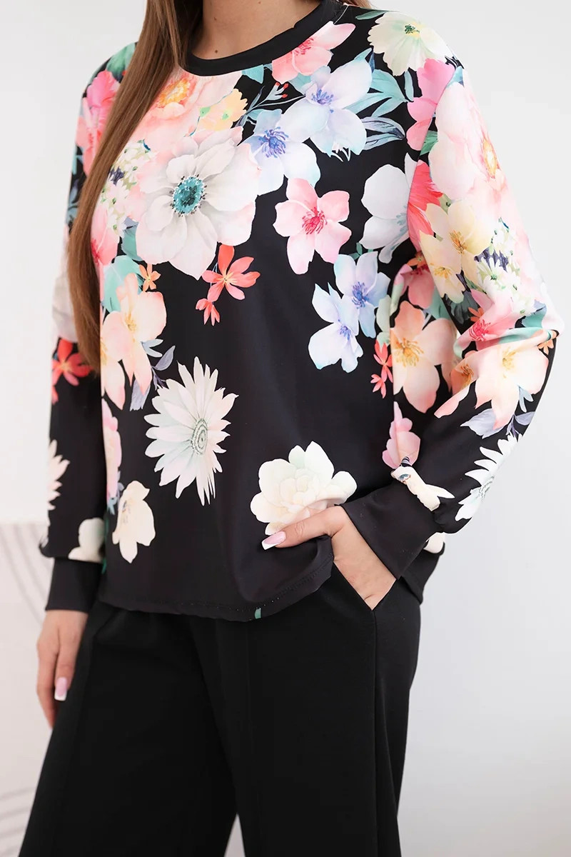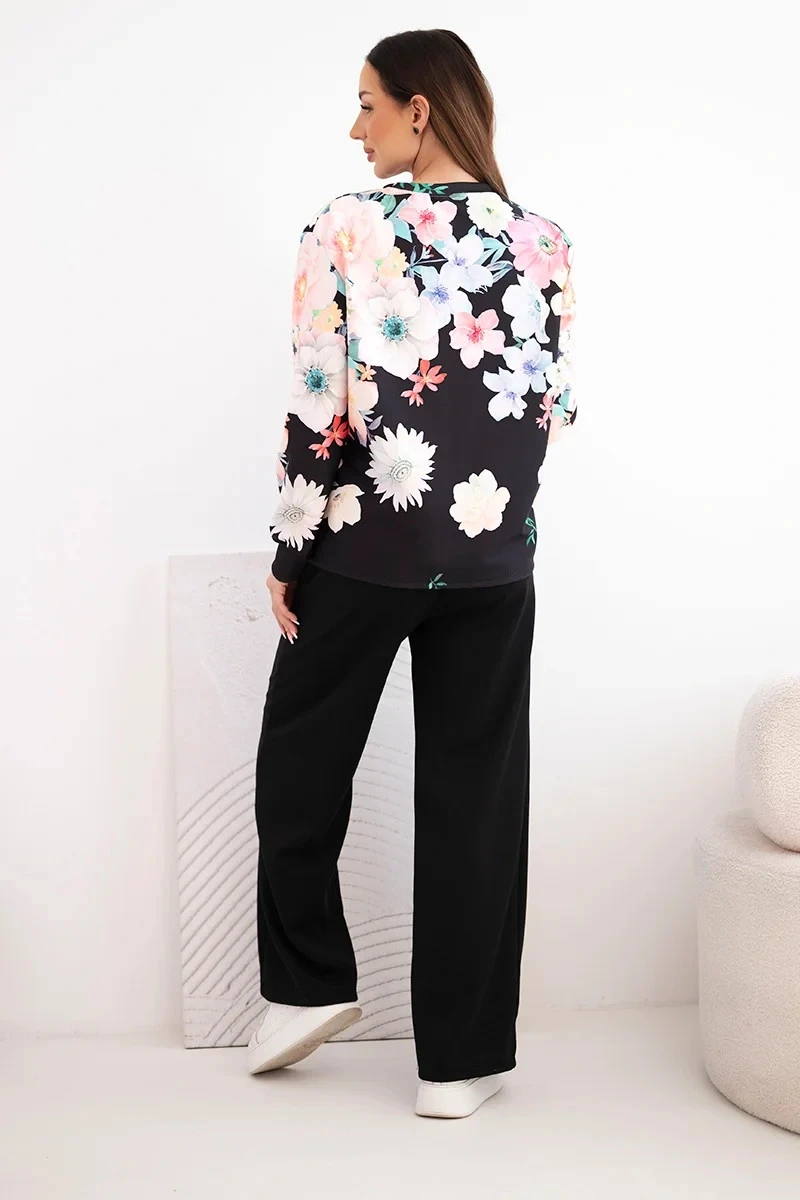 Dámský komplet z měkké viskózy s květinovým vzorem a širokou nohavicí černý