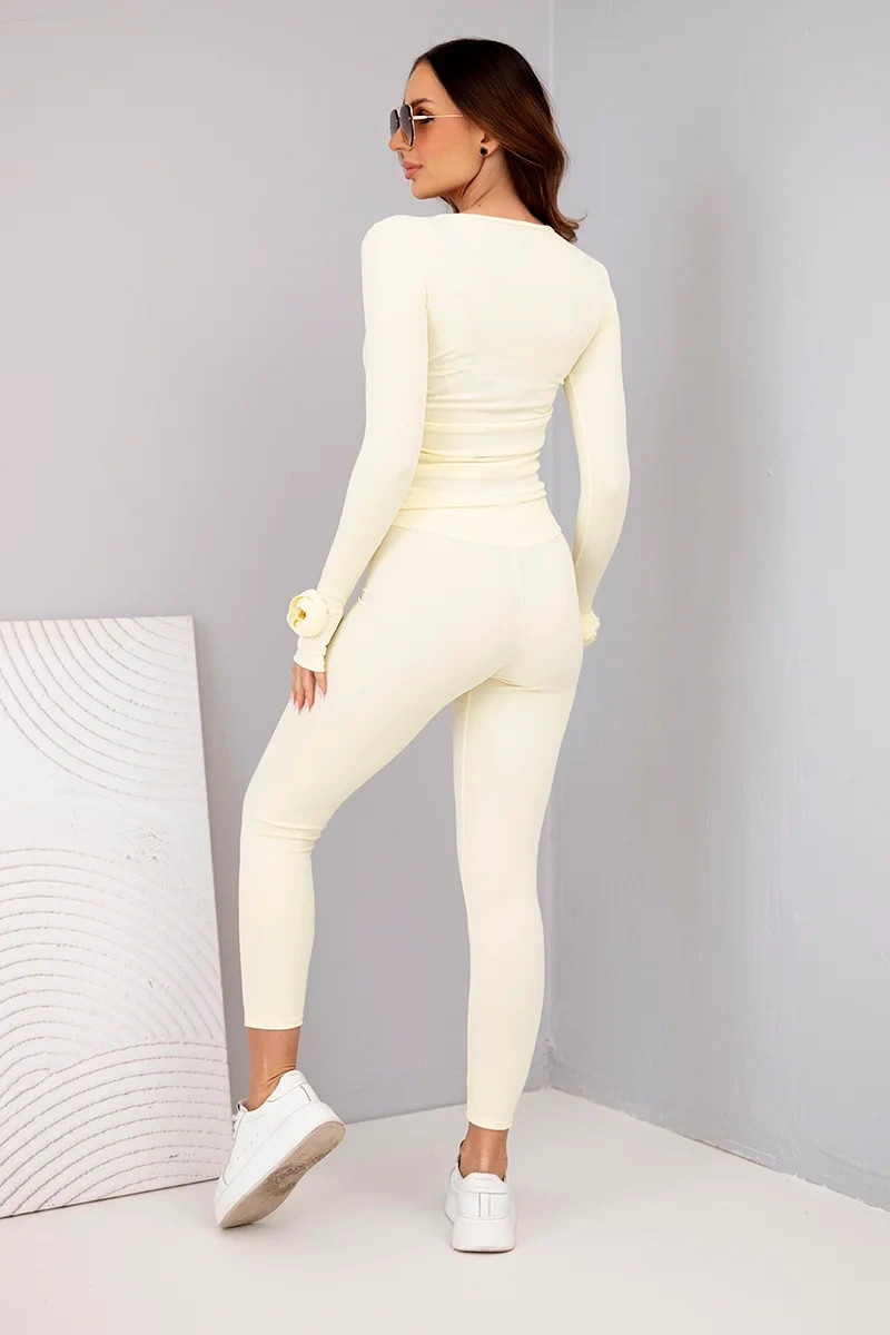 Blůzka se subtilním nařasením po stranách a přiléhavý střih legín krásně podtrhují ženskou postavu. Minimalistický střih dělá, že se komplet skvěle kombinuje s dalšími prvky garderoby, a zároveň vypadá stylově sám o sobě. Ideální na podzim a zimu jako základ pod kardigan nebo bundu.