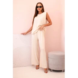 Dámský komplet z viskózy bez rukávů a rovnými kalhotami světlý béžový