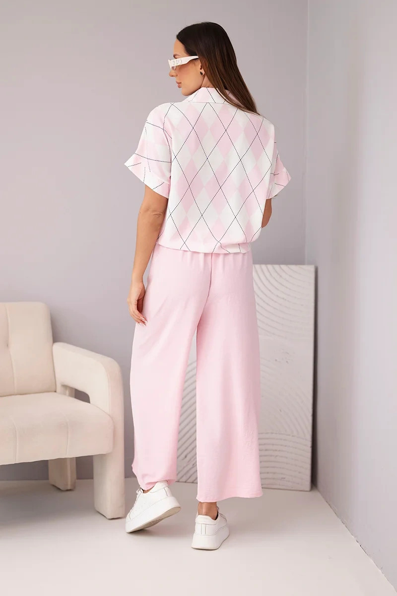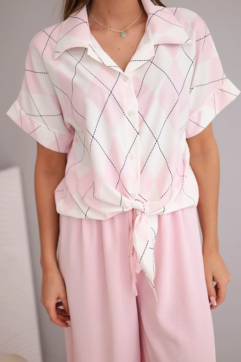 Vsaděte na kouzlo a pohodlí díky tomuto módnímu dámskému setu! Krátká košile s límcem a efektním zavazováním vpředu přitahuje pozornost jemným vzorem v rombích, který dodává celkovému vzhledu subtílní eleganci. Široké kalhoty s gumou v pase vyrobené z lehkého, vzdušného materiálu zajišťují komfort nošení a volnost pohybu po celý den. Tento set je ideální na každodenní nošení, schůzky s přáteli nebo letní procházky. Může se nosit dohromady nebo samostatně, čímž vytvoříte mnoho ženských stylizací.