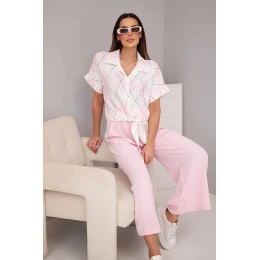 Dámský komplet z viskózy, košile s vázáním a kalhoty s gumou, pudrově růžová