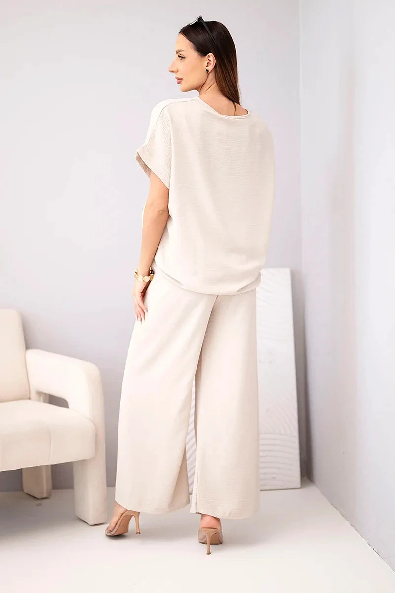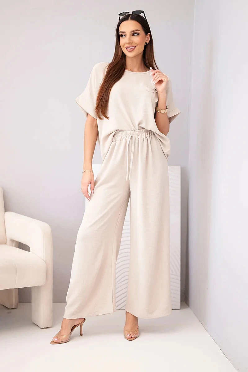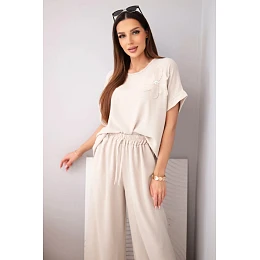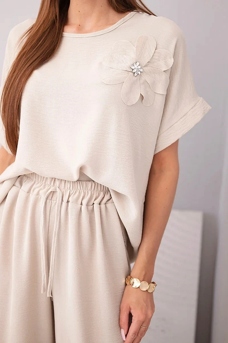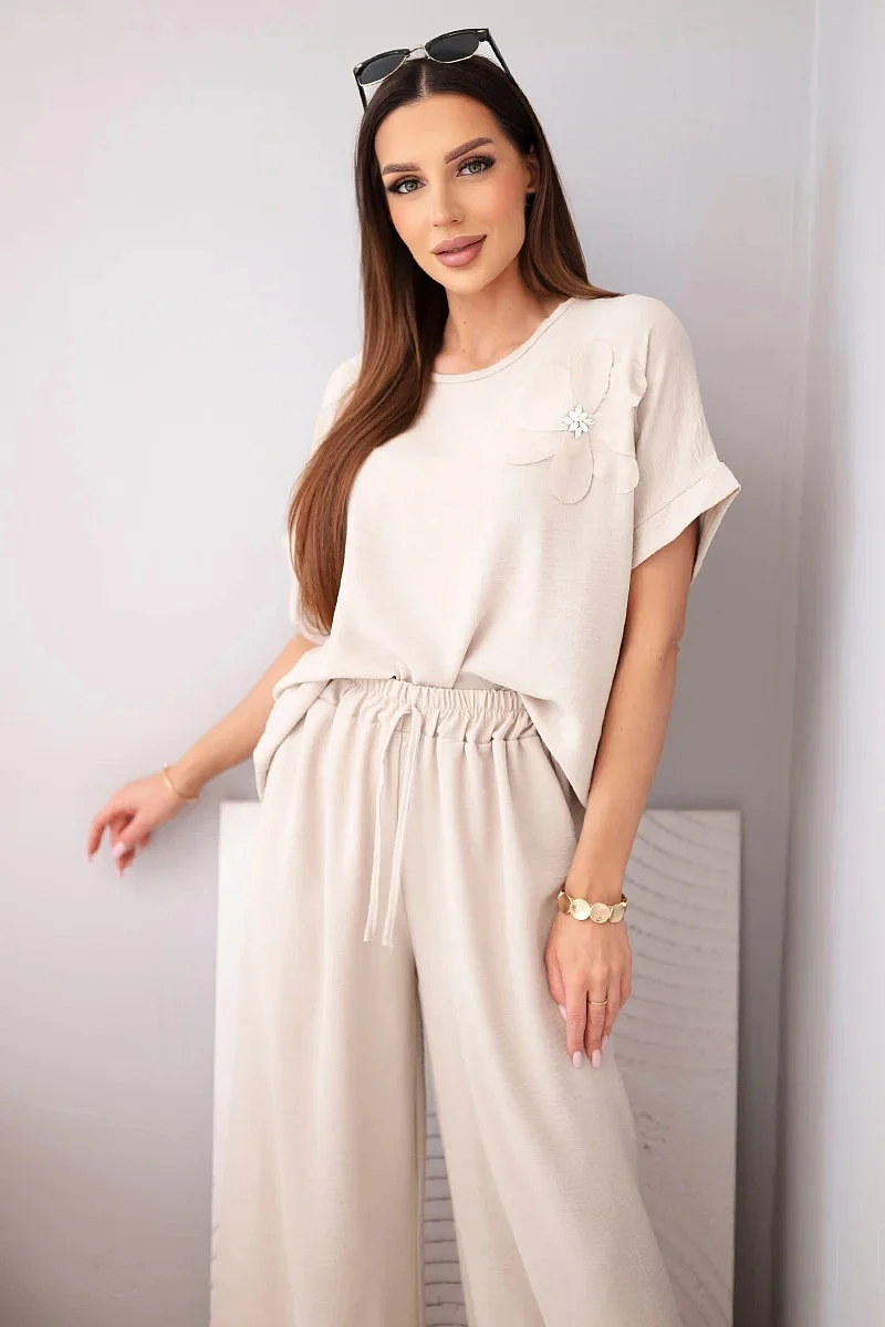 Dámský komplet z viskózy s ozdobným květem a širokými kalhotami béžový
