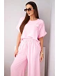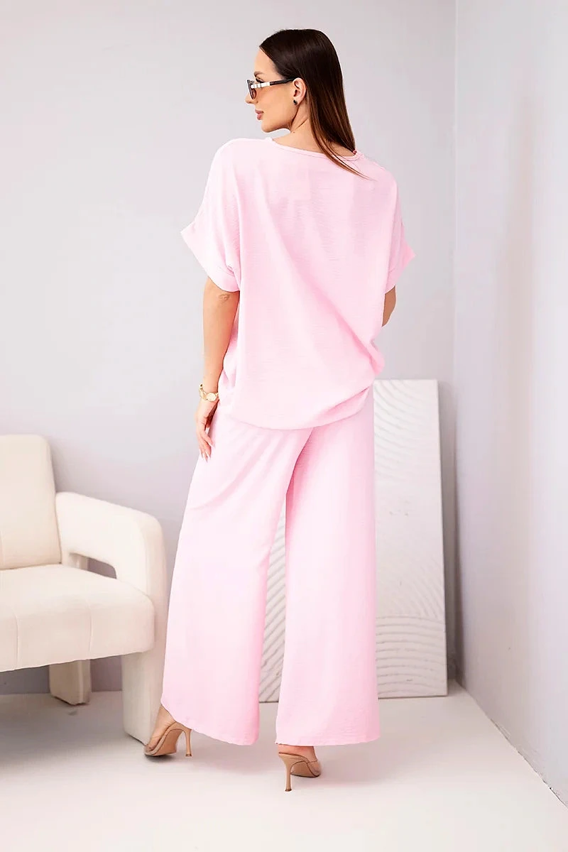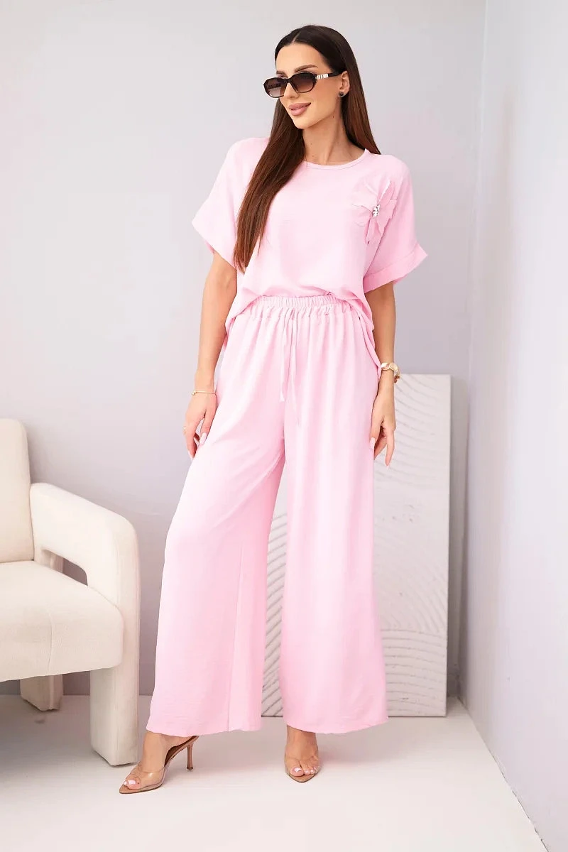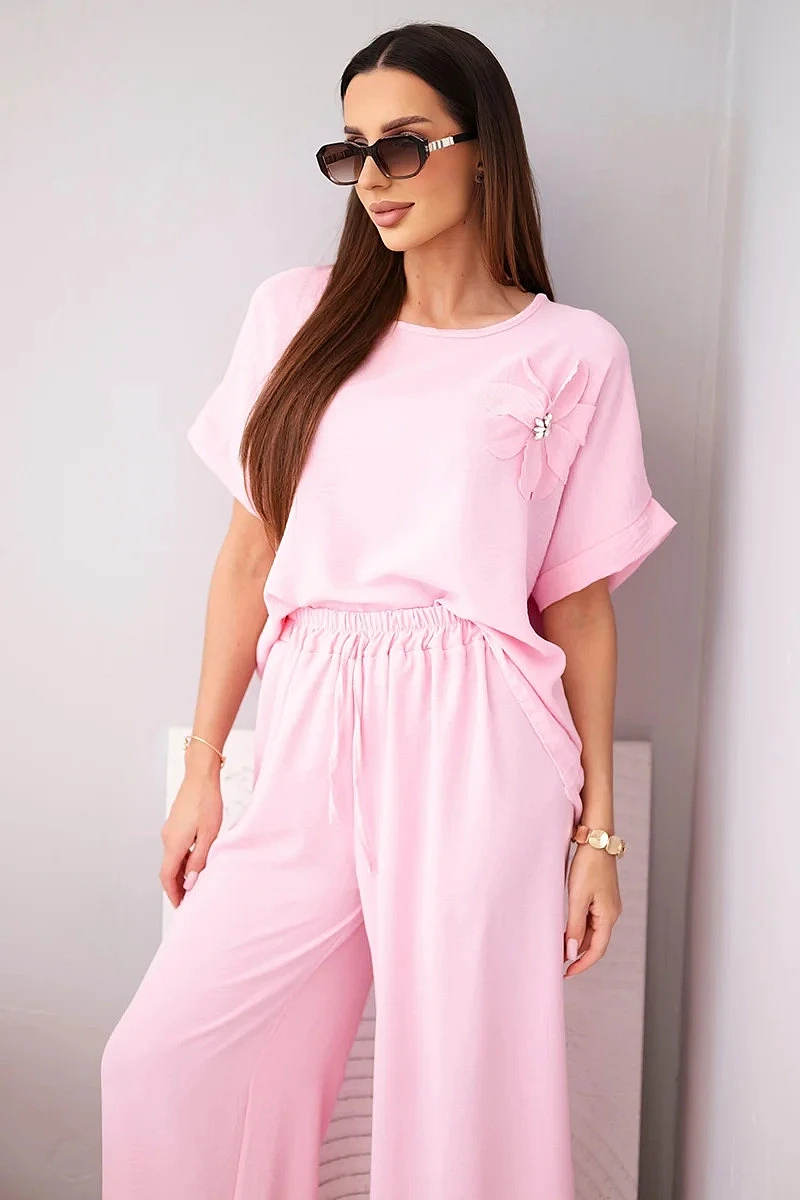 Dámský komplet z viskózy s ozdobným květem a širokými kalhotami bonbónově růžová