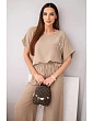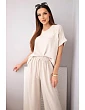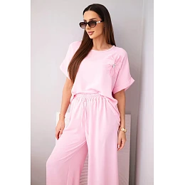 Dámská souprava vytvořená s ohledem na pohodlí a ženský styl. Skládá se z trička s krátkým rukávem a kalhot se širokou nohavicí a elastickým pasem se šňůrkou. Vyrobená z měkké a prodyšné viskózové pleteniny s přídavkem elastanu – ideální pro každodenní nošení. Tričko s výstřihem do V a jemným lesklým nápisem dodává kouzlo, zatímco kalhoty s kapsami a volným střihem zajišťují pohodlí po celý den.