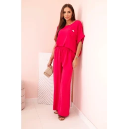 Dámský komplet z viskózy s ozdobným květem a širokými kalhotami - fuchsie