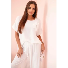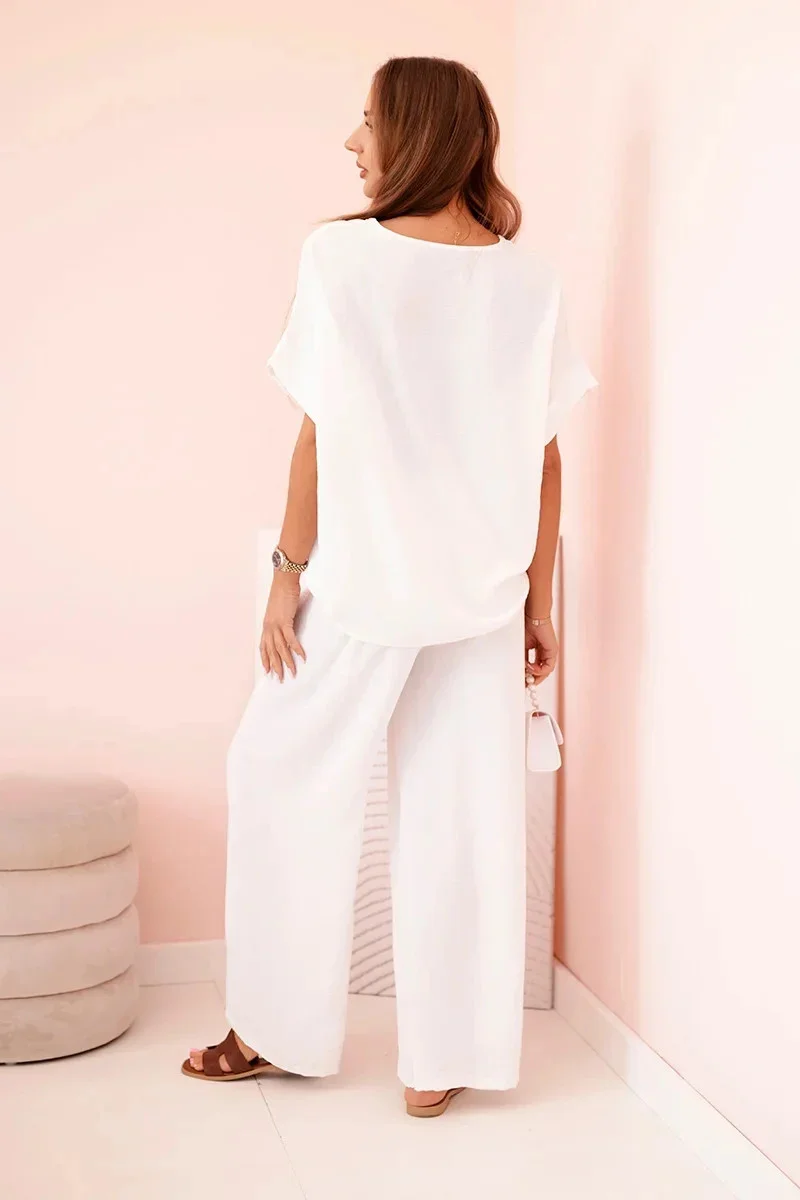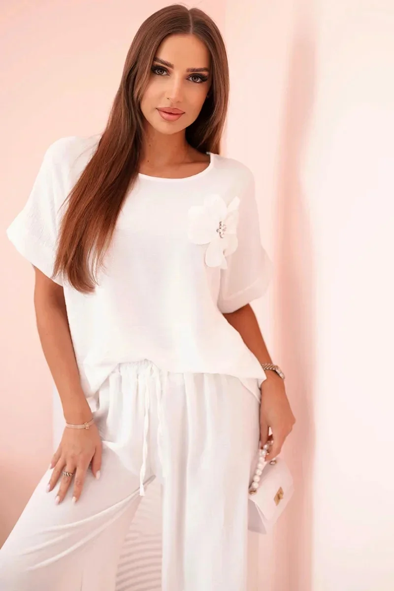 Dámský komplet z viskózy s ozdobným květem a širokými kalhotami - fuchsie bílý