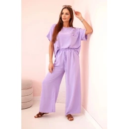 Dámský komplet z viskózy s ozdobným květem a širokými kalhotami - fuchsie světlá fialová