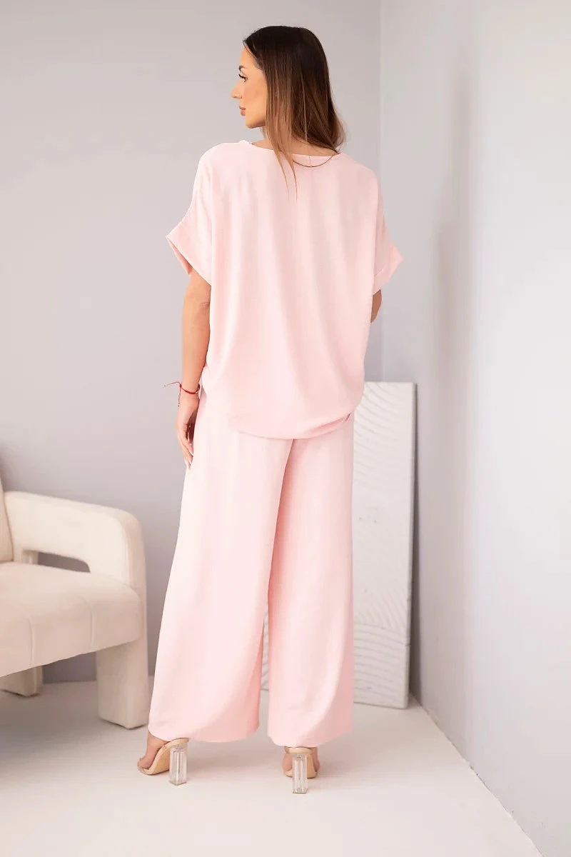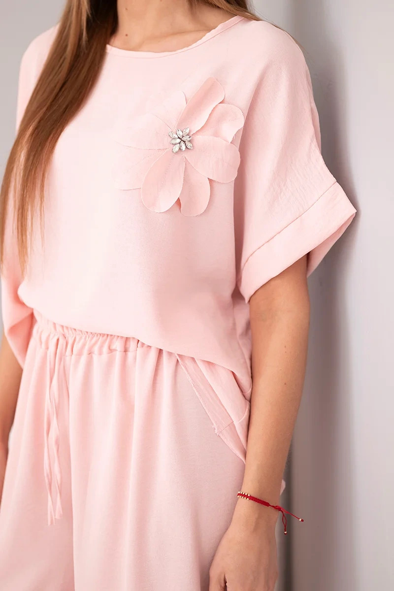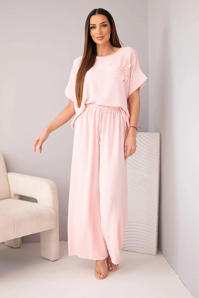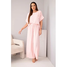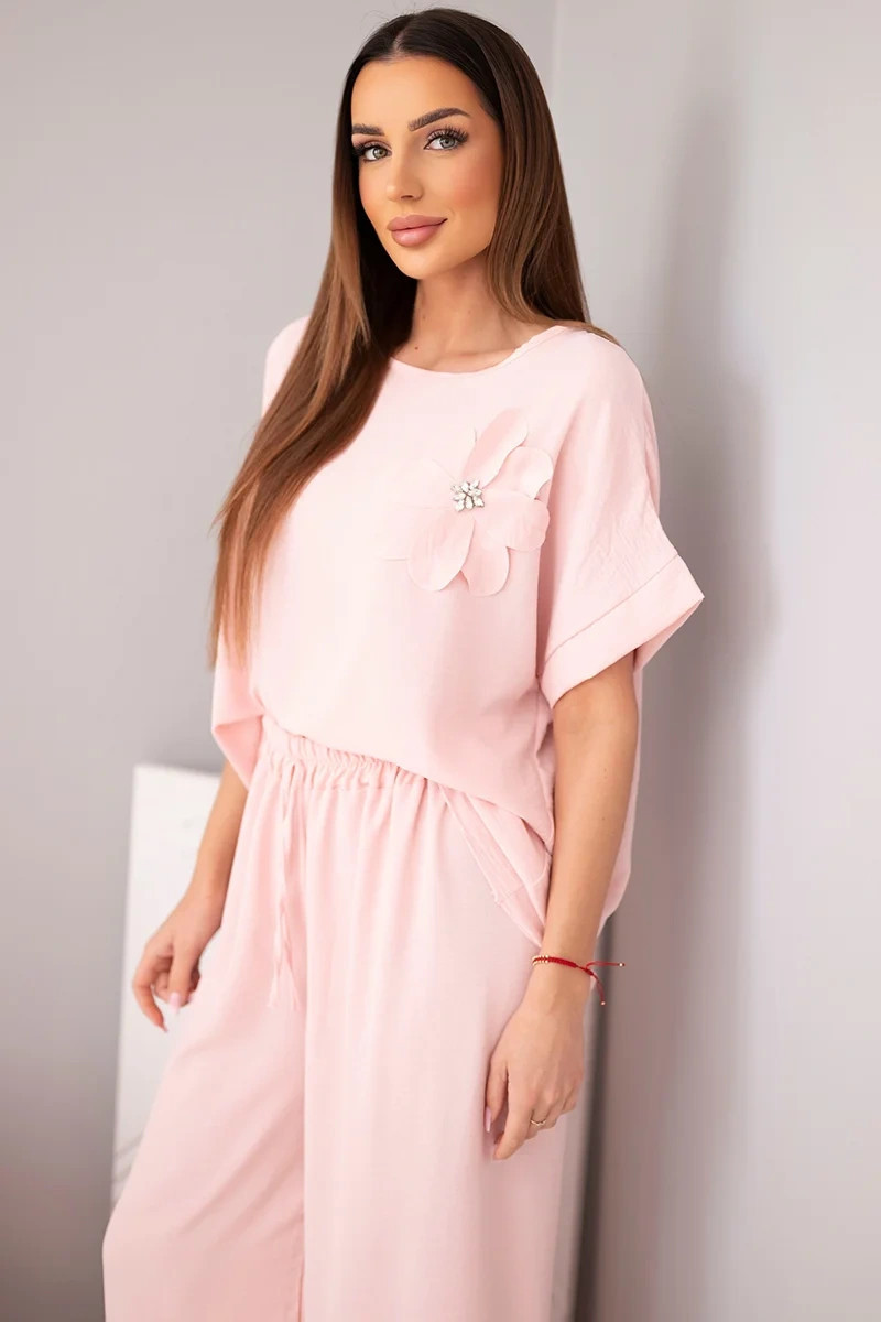 Dámský komplet z viskózy s ozdobným květem a širokými kalhotami pudrově růžová