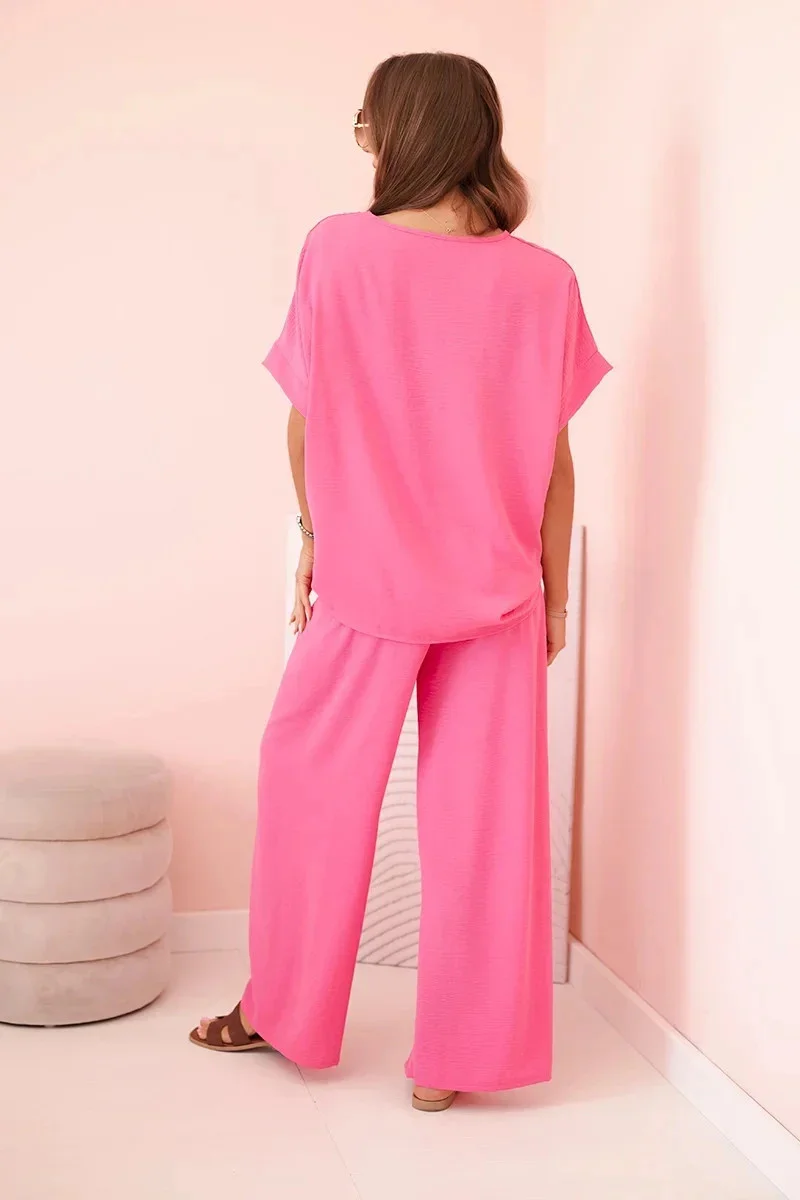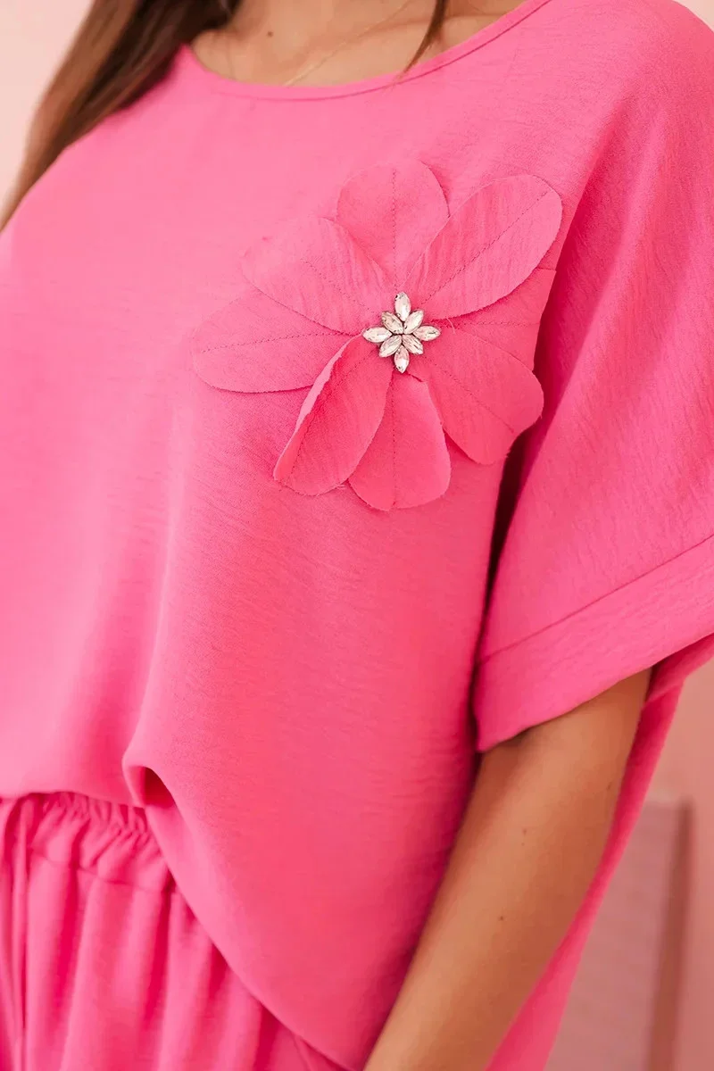 Dámský komplet z viskózy s ozdobným květem a širokými kalhotami - růžový