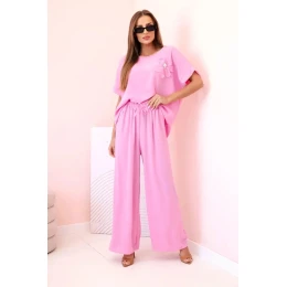 Dámský komplet z viskózy s ozdobným květem a širokými kalhotami světle růžová