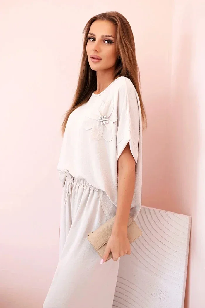 Dámský komplet z viskózy s ozdobným květem a širokými kalhotami tmavě béžová