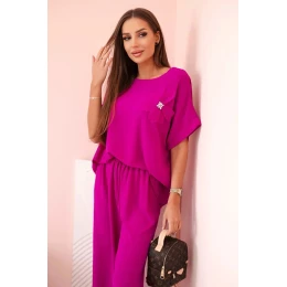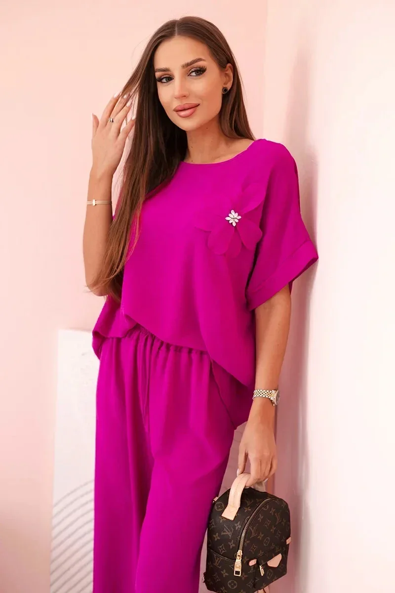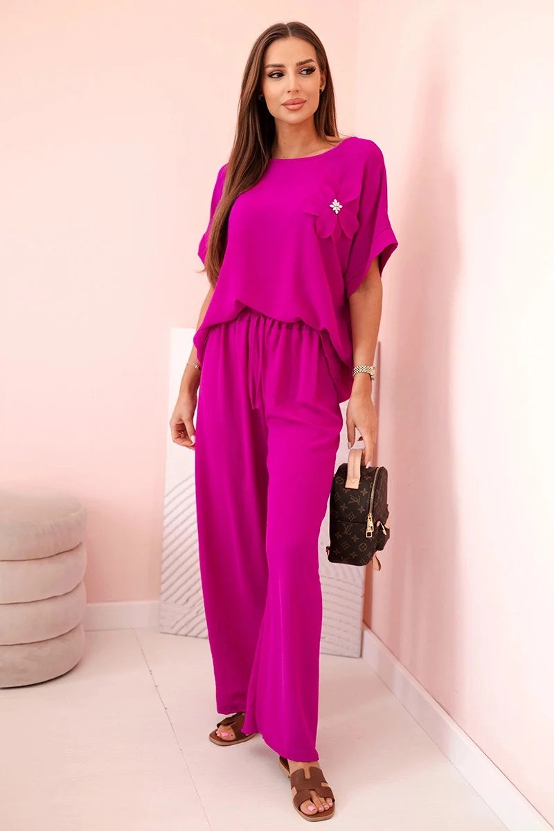 Dámský komplet z viskózy s ozdobným květem a širokými kalhotami - tmavě fialový