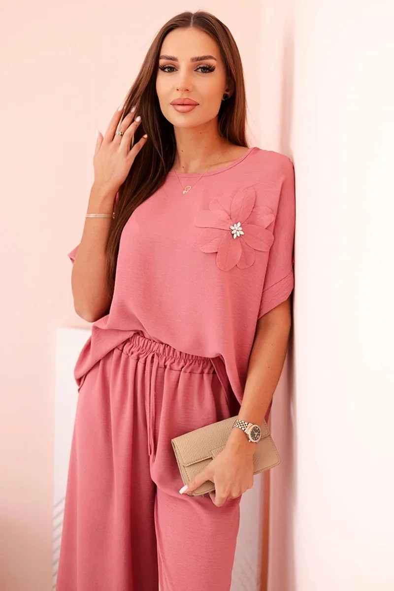 Dámský komplet z viskózy s ozdobným květem a širokými kalhotami - tmavě růžový