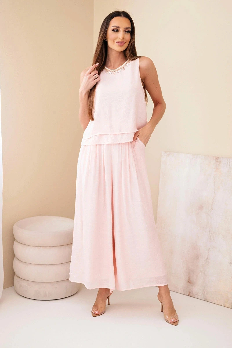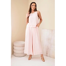 Dámský komplet z viskózy s tílkem bez rukávů a širokými kalhotami s ozdobným zakončením pudrově růžová