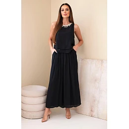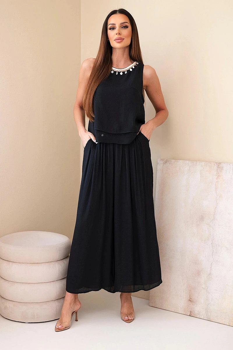 Dámský komplet z viskózy s topem bez rukávů a širokými kalhotami s ozdobným zakončením černý
