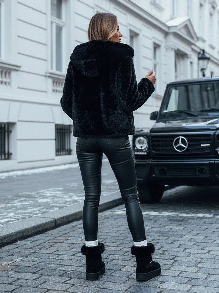 Dámský krátký kabát z příjemné kožešiny je ideální alternativou ke klasickému kabátu. Má kapuci a zip, což zvyšuje jeho funkčnost. Skvěle vypadá v každodenních outfitech, kterým dodává moderní nádech. Ideální volba pro podzimní/zimní sezónu.