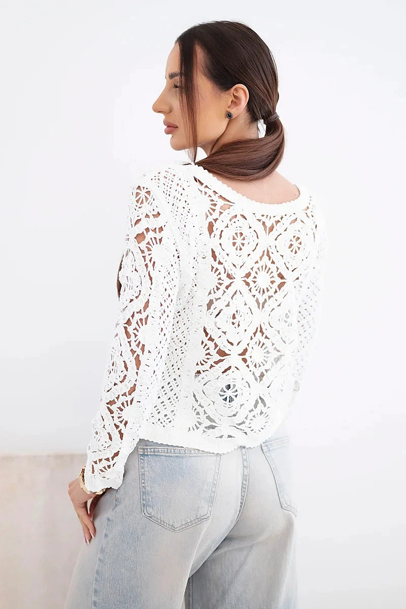 Elegantní dámský bavlněný svetr je vynikající volbou pro ženy, které oceňují kombinaci stylu a pohodlí. Model se vyznačuje efektním ažurovým vzorem s bohatým dekorativním pletením, které dodává celku výjimečný charakter. Jemná krajková struktura činí svetr velmi ženským a jemným, ideálně zapadajícím do současných trendů.