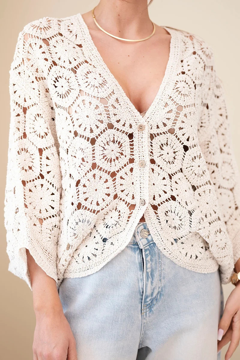 Oversize střih dělá model mimořádně univerzálním a hodí se k různým typům postav. Výstřih do V opticky zeštíhluje krk a přidává ženské kouzlo, zatímco zapínání na knoflíky podtrhuje klasický a současně módní styl. Delší délka umožňuje nosit svetr jak jako svrchní vrstvu, tak jako součást každodenních outfitů.