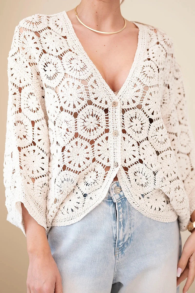 Dámský letní krajkový svetr s knoflíky a dlouhým rukávem černý
