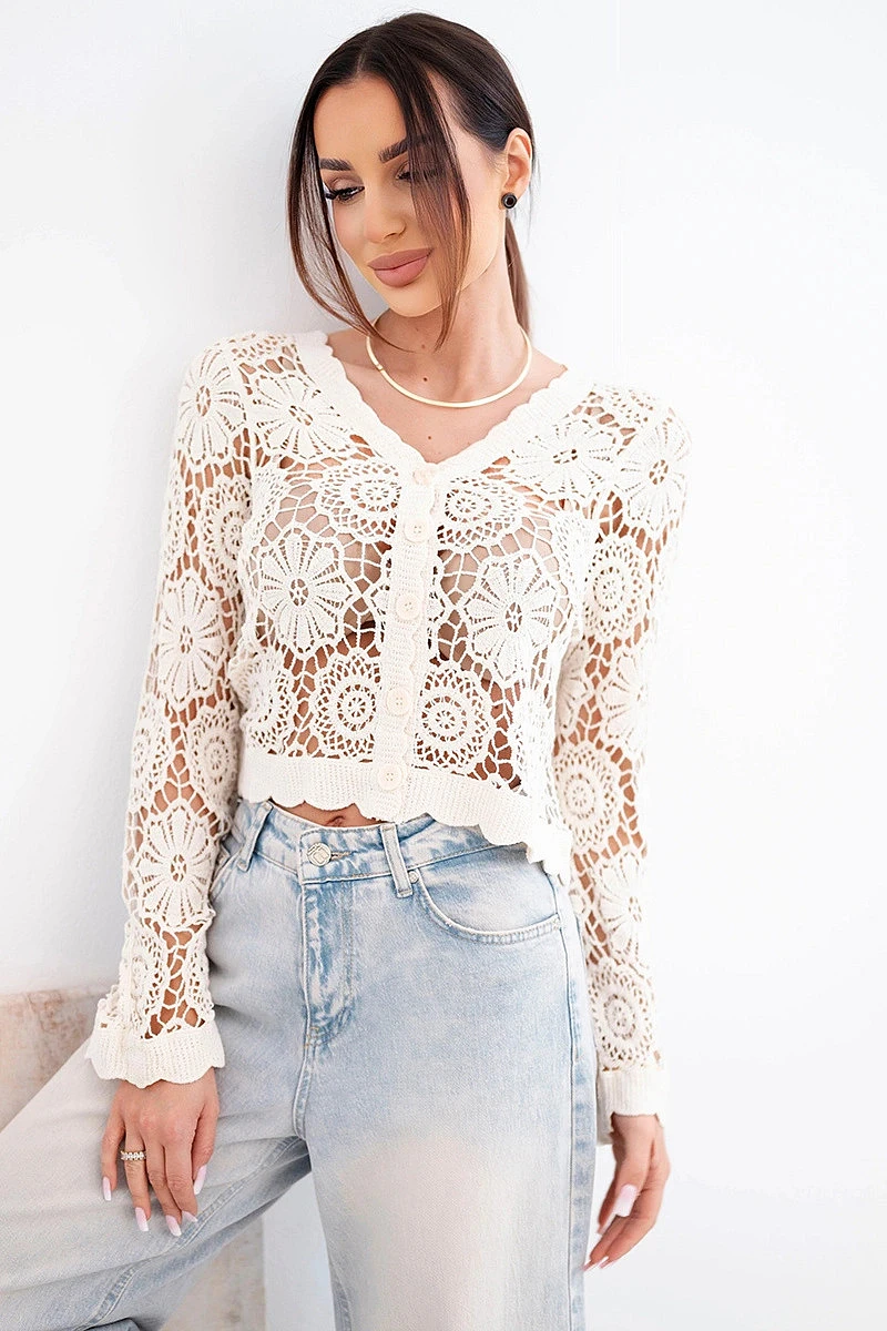 Krátký střih dokonale zvýrazňuje postavu a skvěle se kombinuje s kalhotami nebo sukněmi s vysokým pasem. Dlouhé rukávy zajišťují komfort při nošení v chladnějších dnech a zapínání na knoflíky dodává praktičnost i klasický vzhled. Ažurová struktura činí svetr lehkým a prodyšným, což z něj dělá ideální volbu pro přechodné období i letní večery.