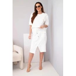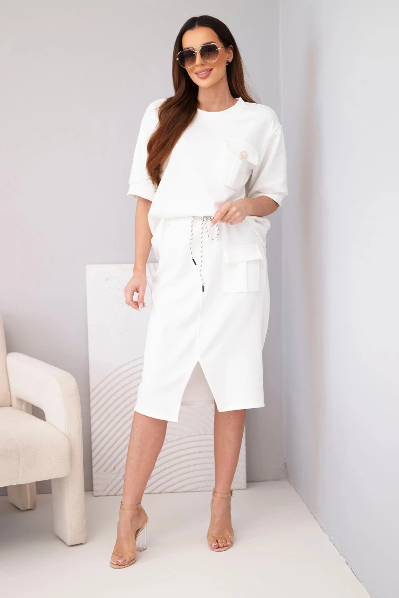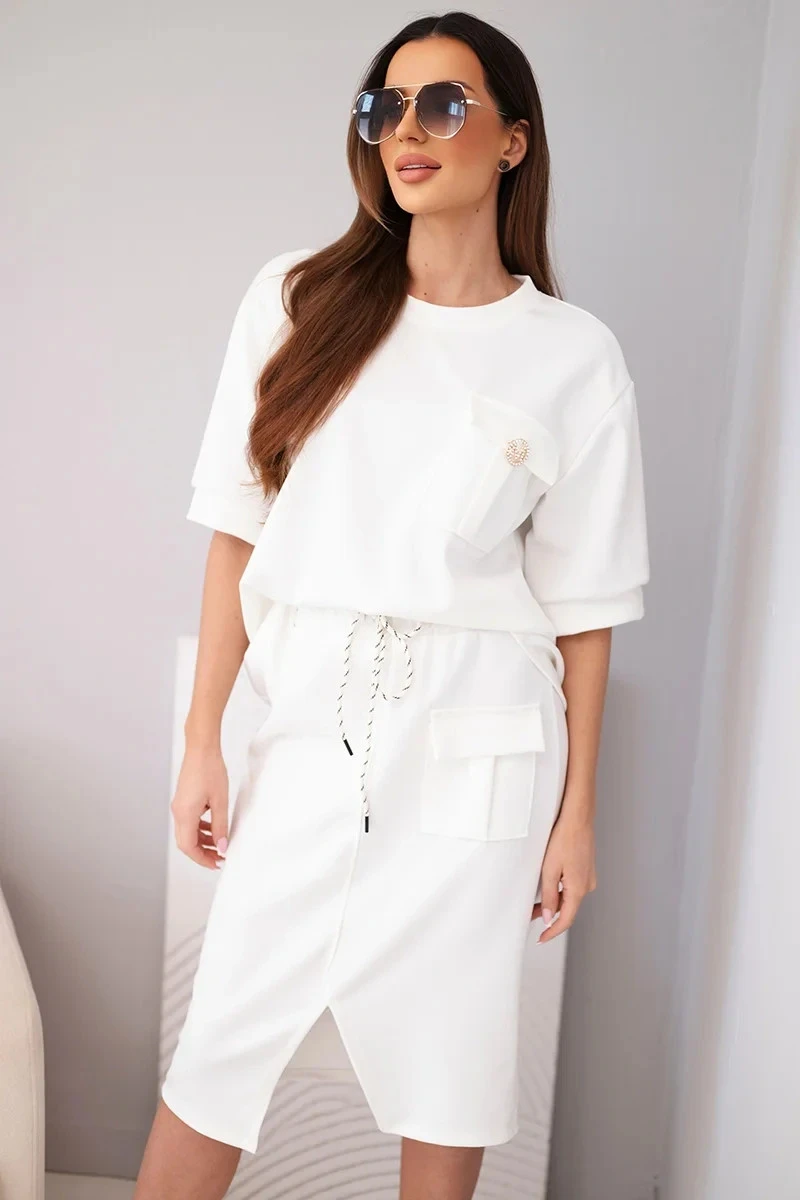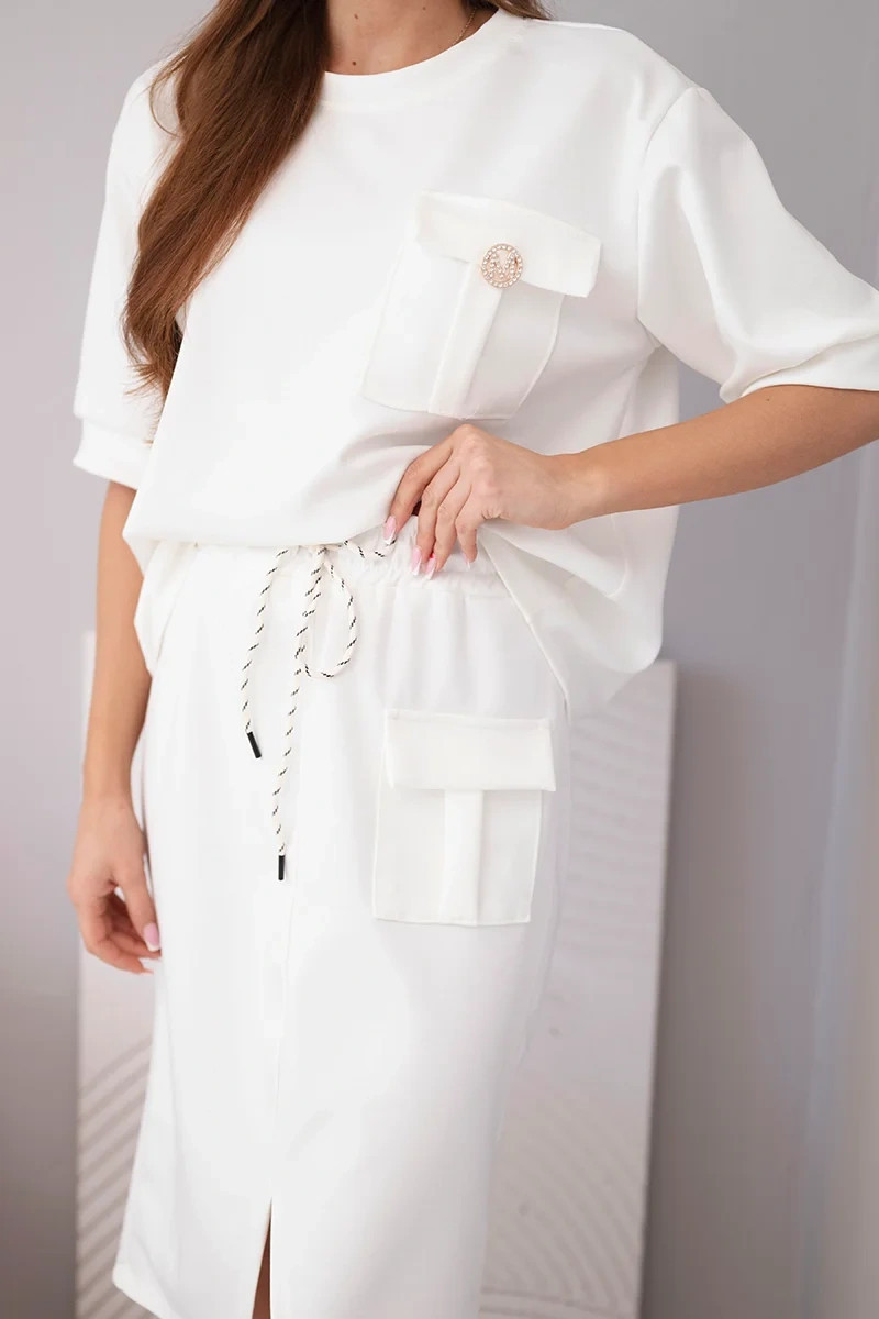 Stylový dámský máslový komplet je ideální volbou pro ženy, které si cení pohodlí a módního vzhledu v jednom. Souprava se skládá z volného topu s krátkým rukávem a přiléhavé midi sukně s elastickým pasem. Hladký materiál s příjemnou, měkkou strukturou se krásně přizpůsobí postavě a zajišťuje pohodlí po celý den. Ozdobná kapsa typu cargo na topu i sukni dodává celku moderní charakter a zavazování v pase zvýrazňuje ženskou siluetu.