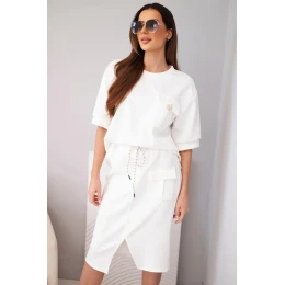 Stylový dámský máslový komplet je ideální volbou pro ženy, které si cení pohodlí a módního vzhledu v jednom. Souprava se skládá z volného topu s krátkým rukávem a přiléhavé midi sukně s elastickým pasem. Hladký materiál s příjemnou, měkkou strukturou se krásně přizpůsobí postavě a zajišťuje pohodlí po celý den. Ozdobná kapsa typu cargo na topu i sukni dodává celku moderní charakter a zavazování v pase zvýrazňuje ženskou siluetu.