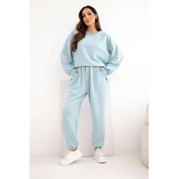 Stylový dámský komplet, který spojuje pohodlí s módním designem. Mikina s efektním, lesklým motivem na přední straně přitahuje pohledy a dodává celé stylizaci výjimečný charakter. Kalhoty s jednoduchým střihem a elastickým pasem a šňůrkou zajišťují pohodlí a volnost pohybu.