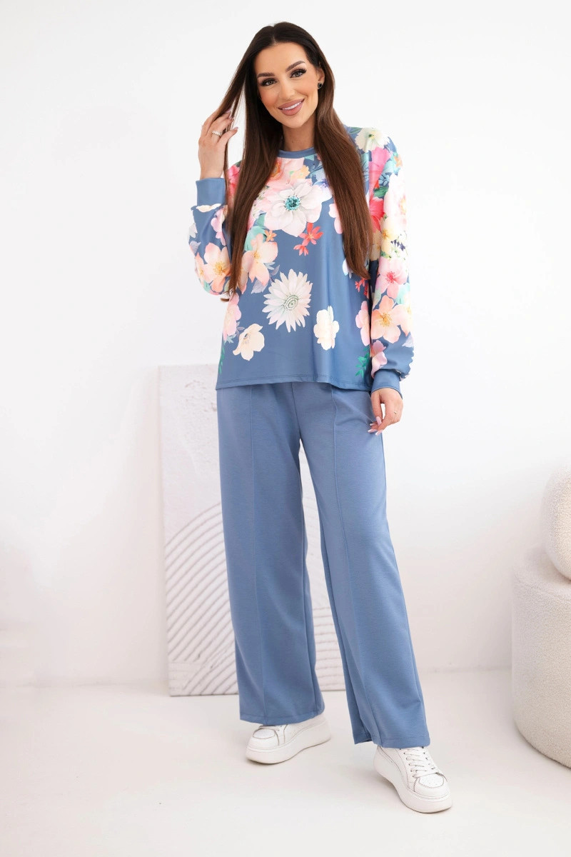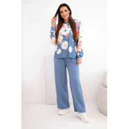 Dámský máslový viskózový komplet s květinovým vzorem a širokými nohavicemi jeansový
