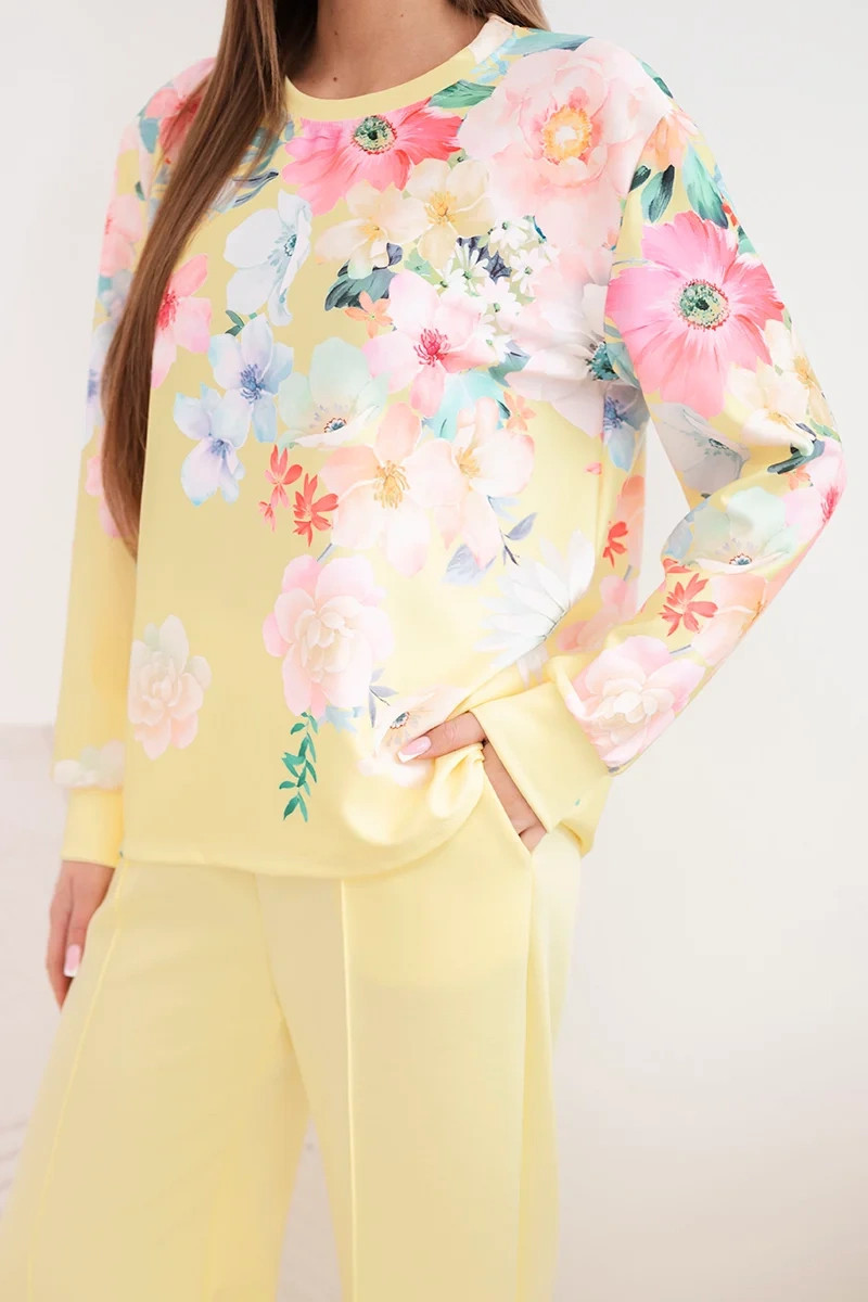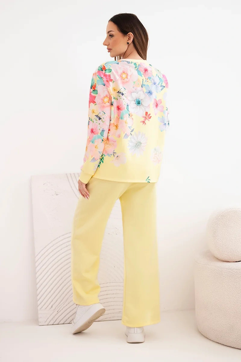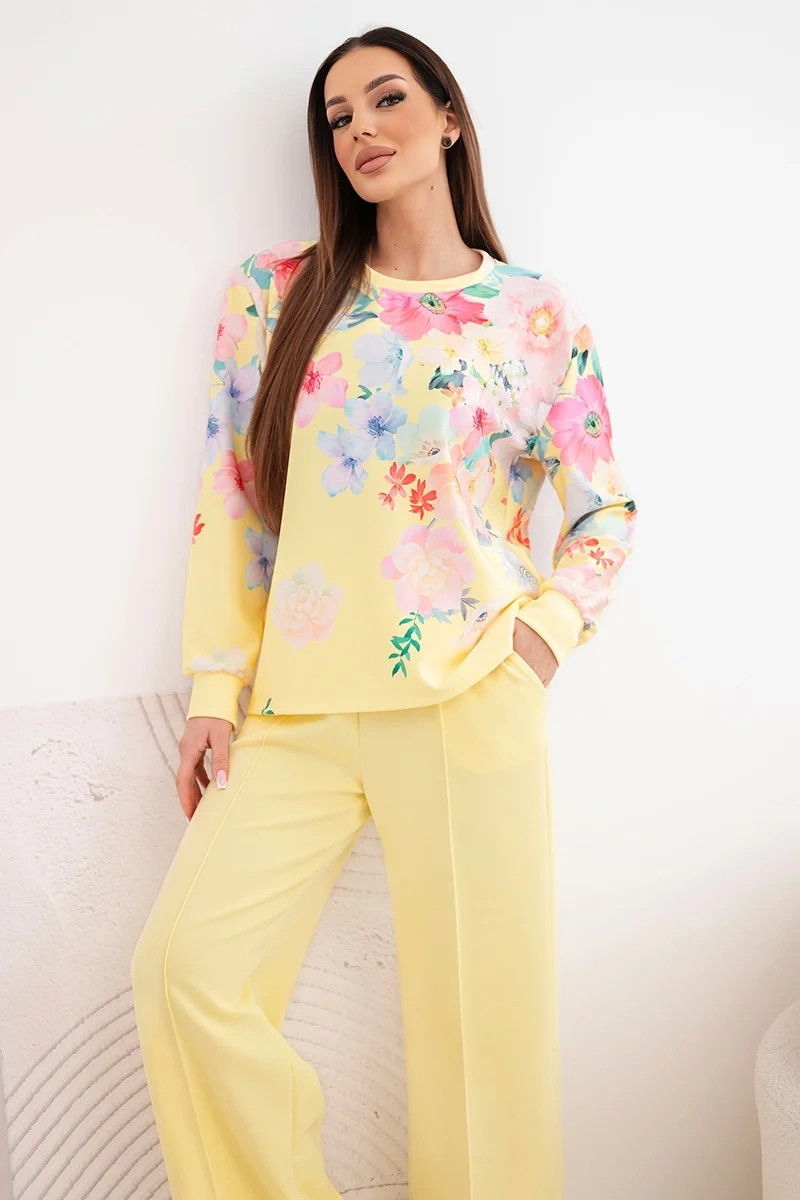 Dámský máslový viskózový komplet s květinovým vzorem se širokými nohavicemi žlutý