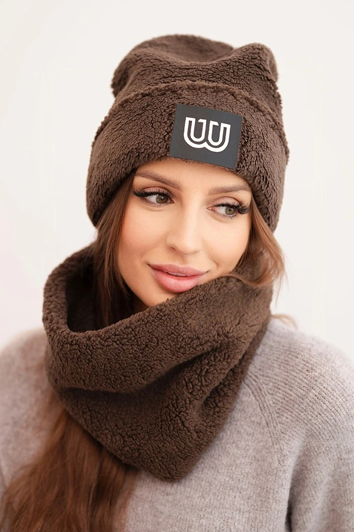 Dámský model 21495009 komplet čepice a nákrčník s ozdobnou nášivkou hnědý - K-Fashion