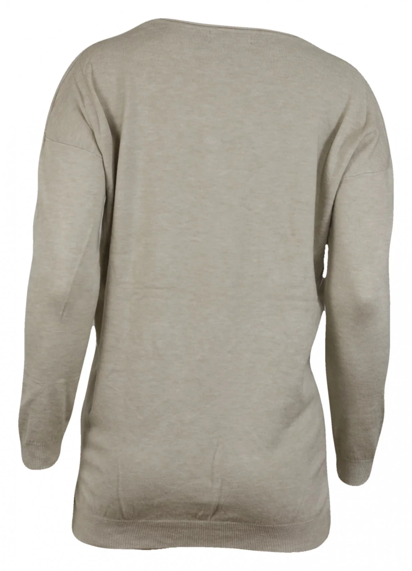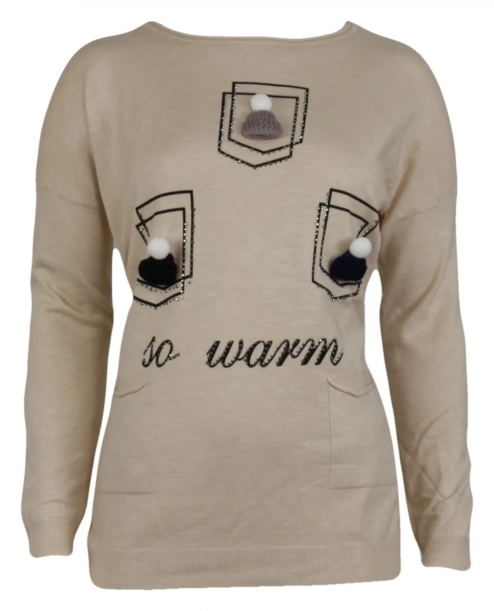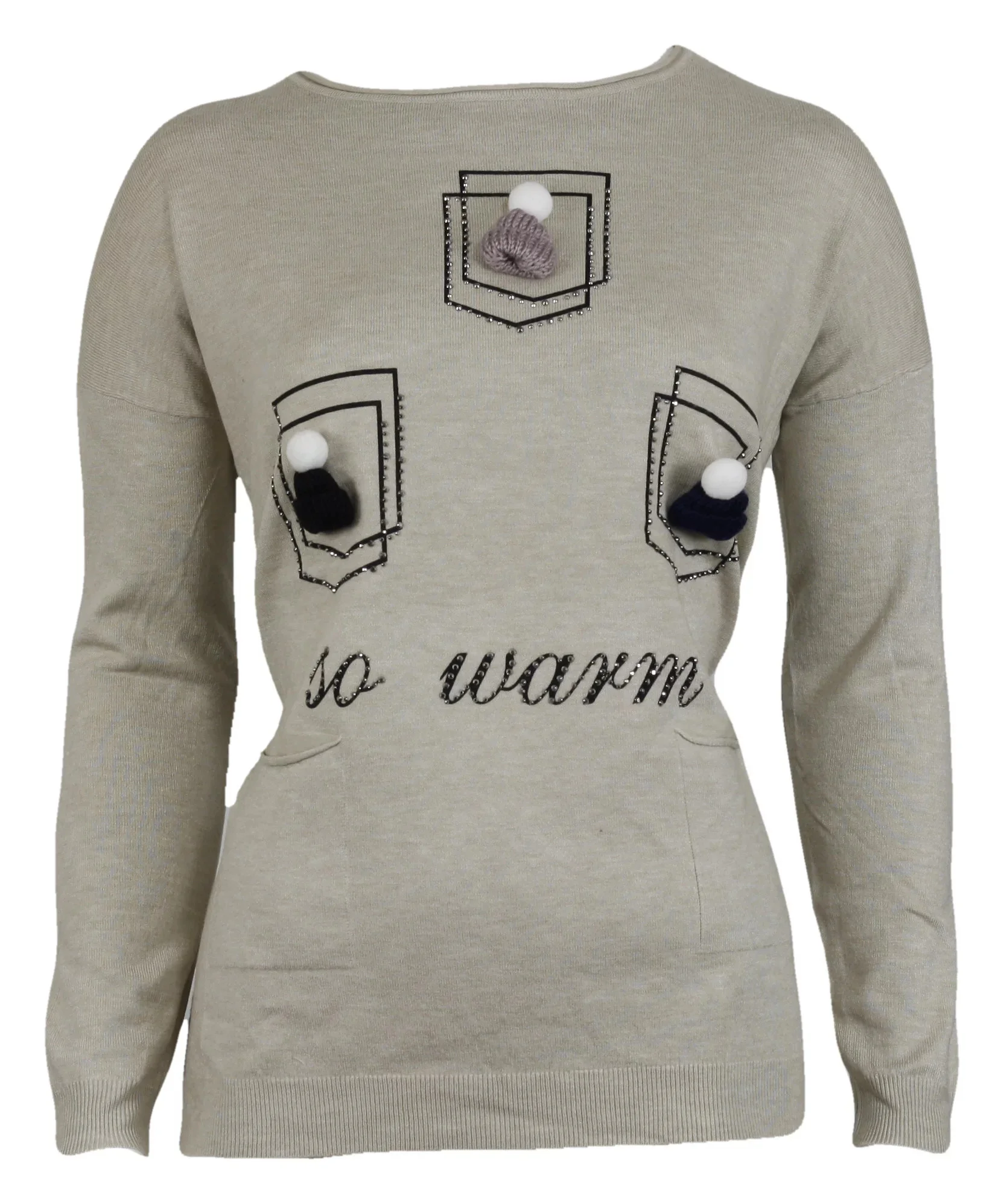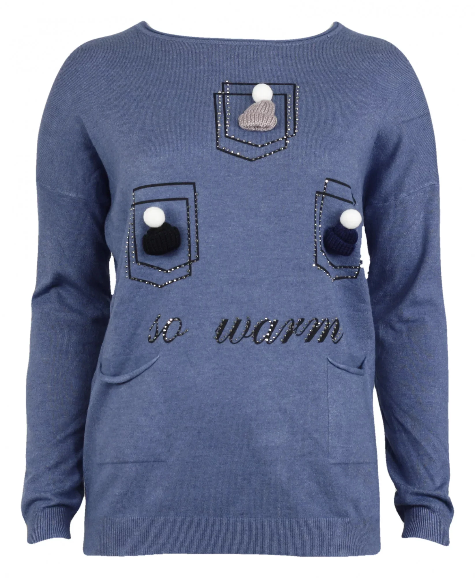 Dámský svetřík L5102 - Cristina s kulatým výstřihem, přední díl zdobí pletené čepičky a dvě kapsičky ve spodní části. Materiál 42% viskóza, 33% polyamid, 15% modal, 10% elastan.