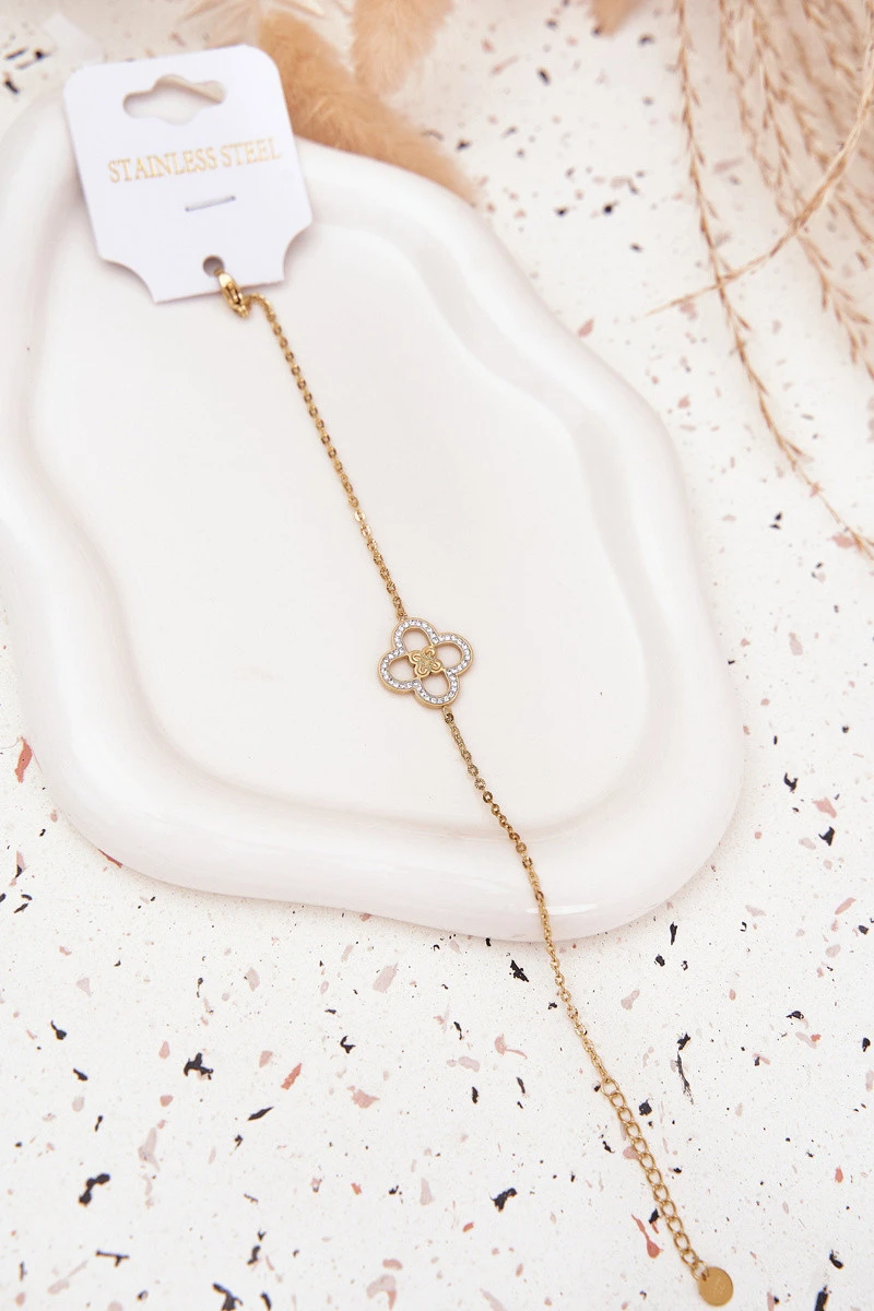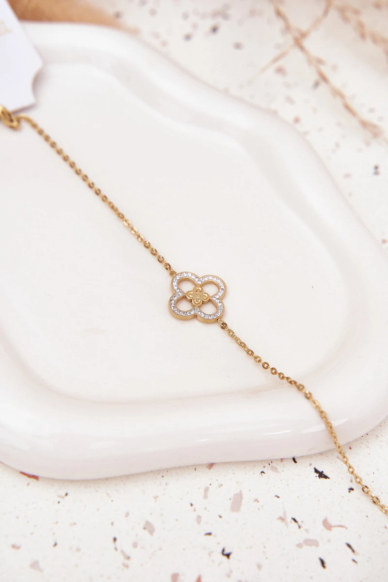 Dámská náramek vyrobená ze chirurgické oceli v zlaté barvě je doplňkem, který dodá každému outfitu lesk. Ozdobena lesklými čirými kamínky, vypadá nenápadně a velmi ženský. Nastavitelná spona umožňuje dokonale přizpůsobit velikost zápěstí a zajišťuje pohodlné nošení. Stylová, odolná a univerzální — ideální pro každodenní nošení i výjimečné příležitosti.