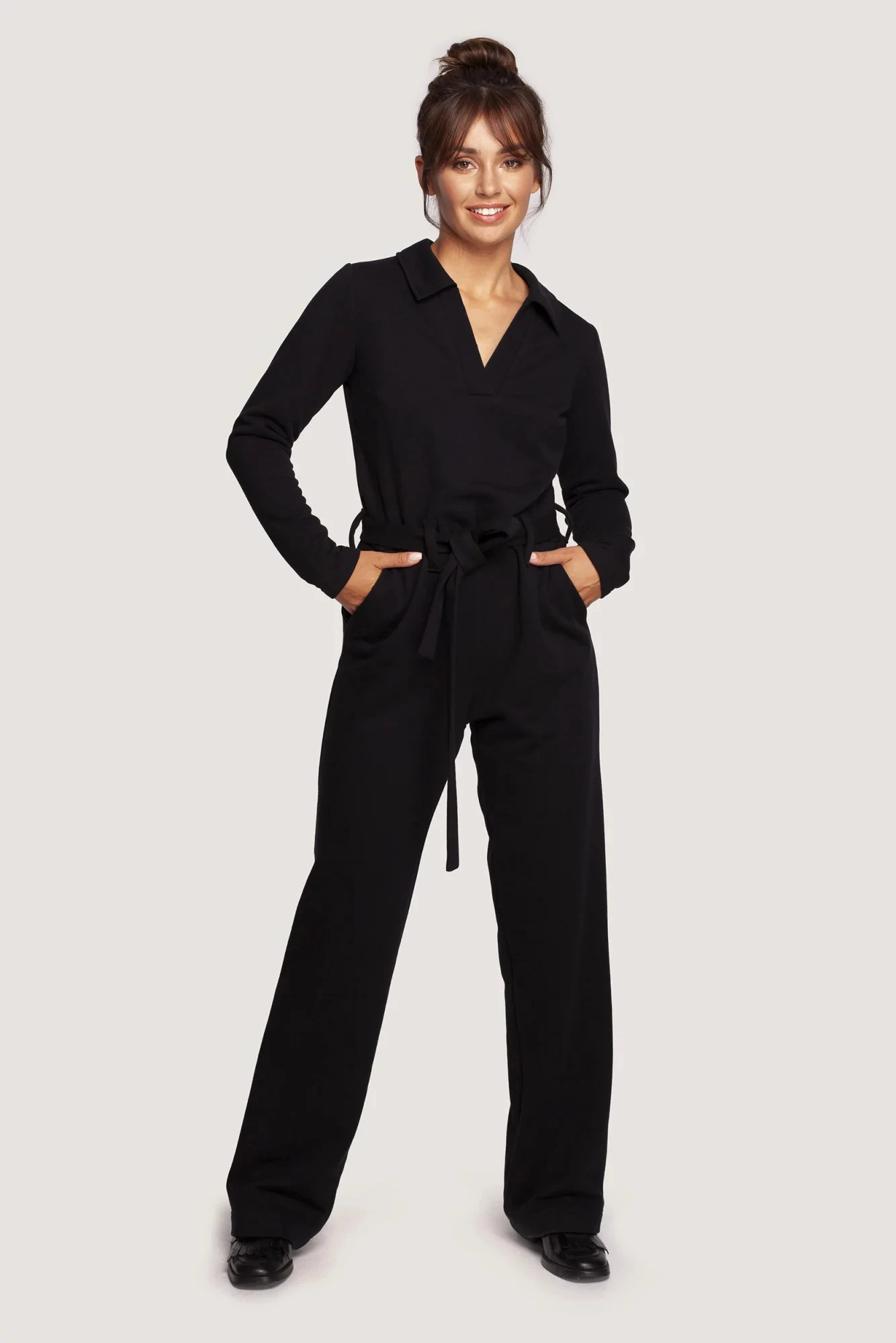 Milujeme kombinézy a vy je budete milovat také. Elegantní detaily - decentní výstřih do V zakončený límcem, široký střih nohavic a pásek na zavázání pro závěrečný dotek: tento úpletový overal z jednoho kusu je hotovým top outfitem.
