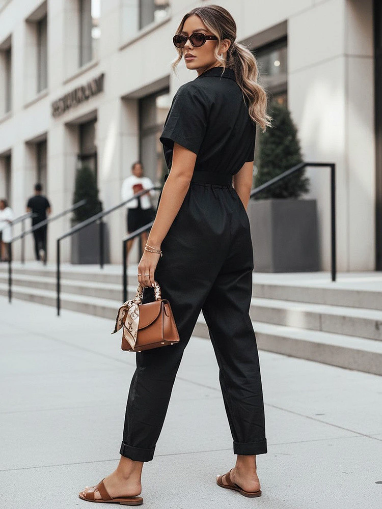 Dámský overal moderního střihu kombinuje pohodlí s minimalistickým stylem. Pečlivě propracovaný střih s páskem v pase zvýrazňuje siluetu a zajišťuje pohodlí při nošení. Krátké rukávy a klasický límec mu dodávají lehce strukturovaný charakter. Model se skvěle hodí do každodenních městských stylizací.