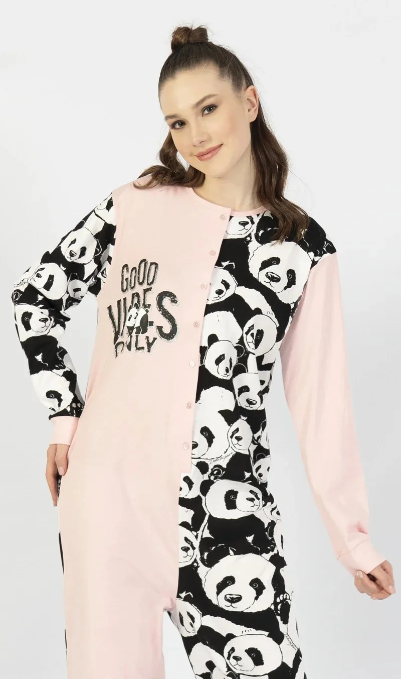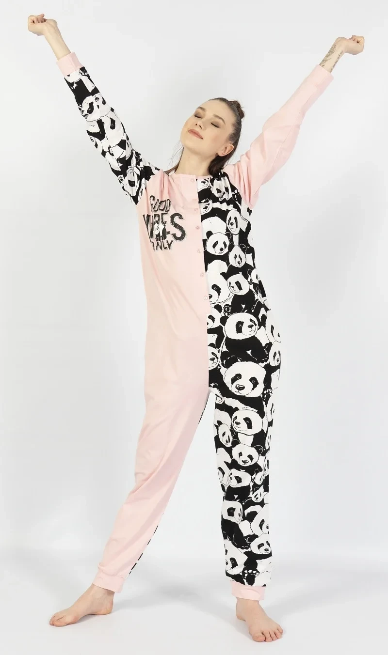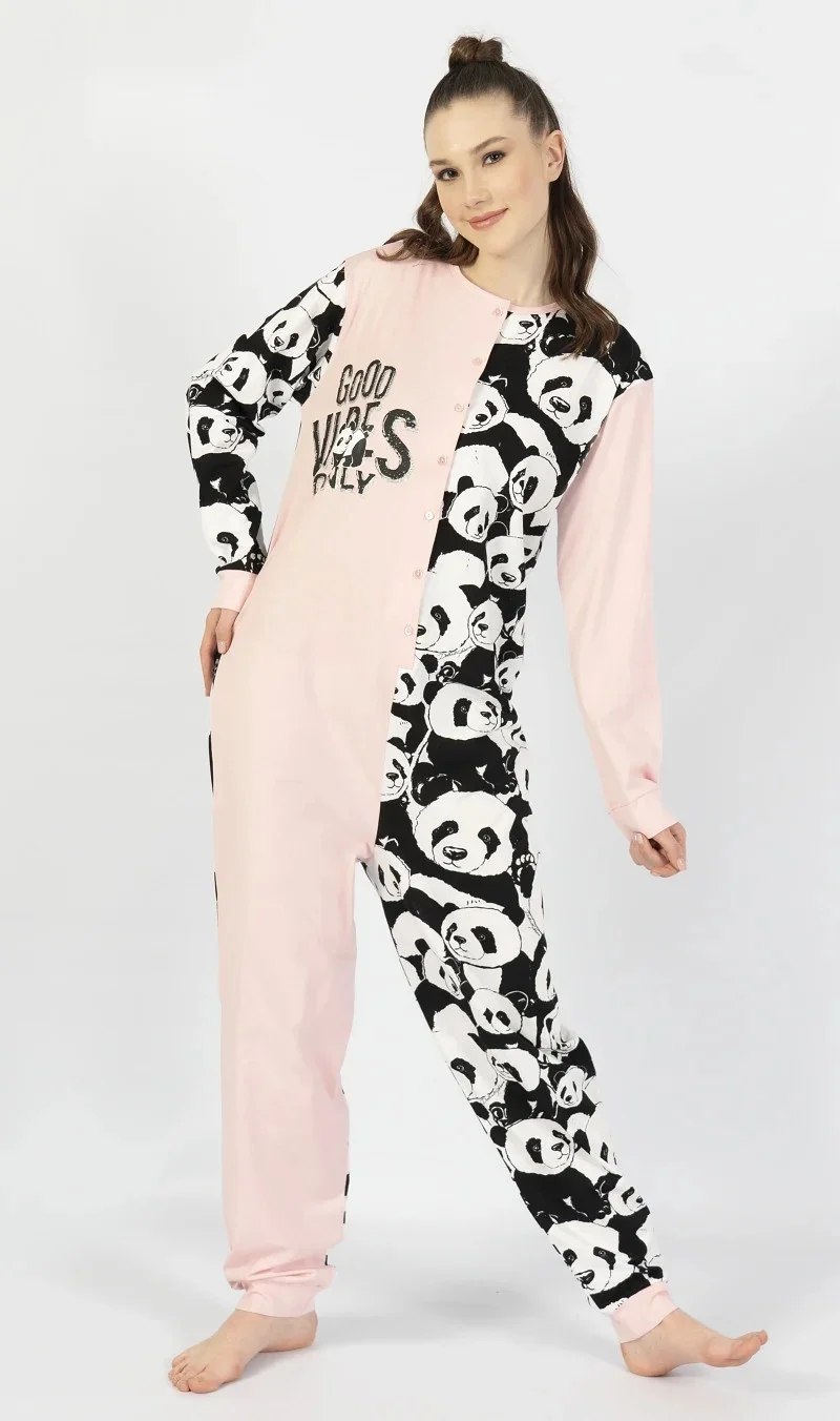 Dámský bavlněný overal Good vibes. Overal je celopropínací - z jedné strany zdobený obrázkem pandy a nápisem 'Good vibes only', z druhé strany celoplošným potiskem pandy. Dlouhé nohavice jsou ukončeny elastickými lemy. Bavlněný materiál je poddajný a příjemný na dotek.