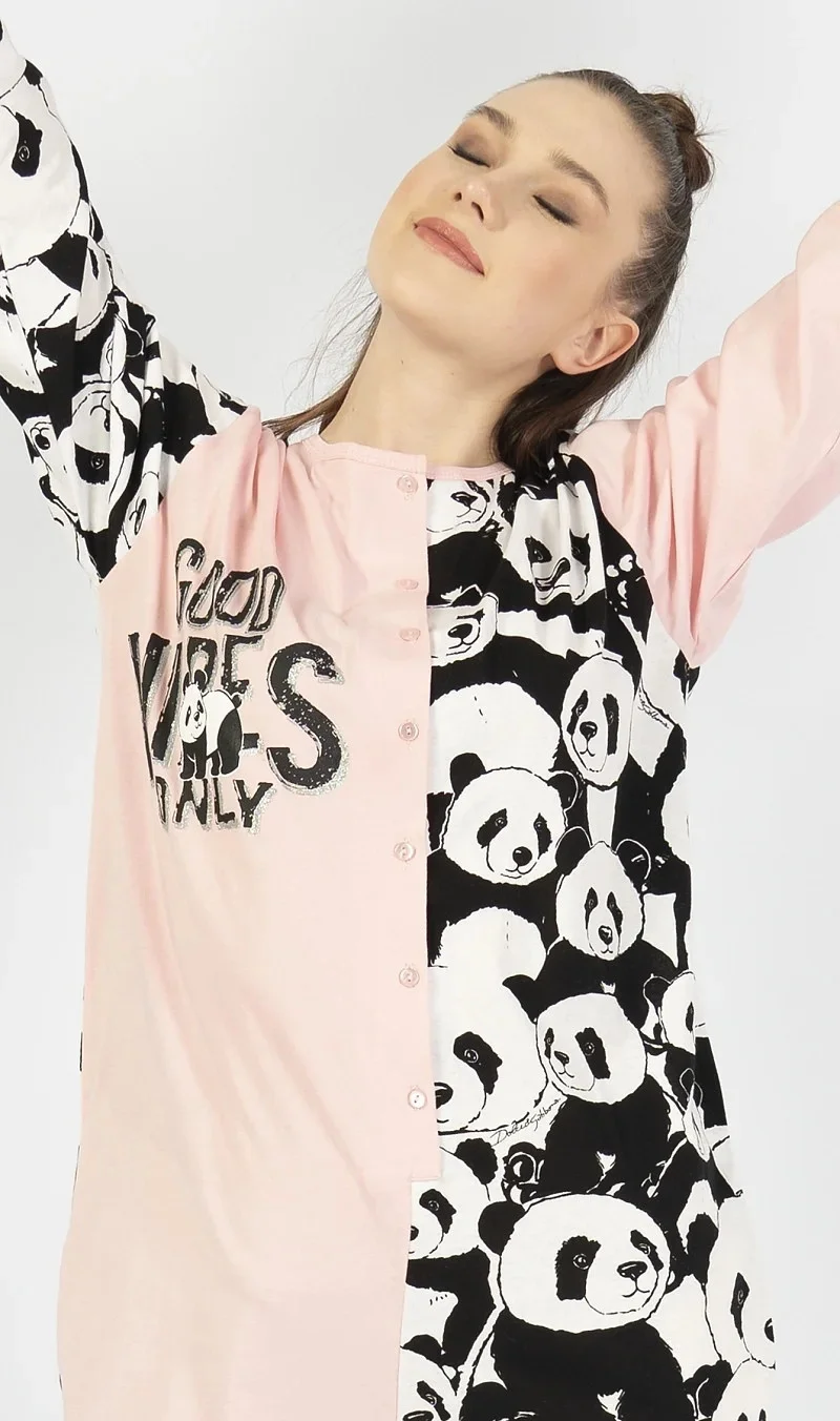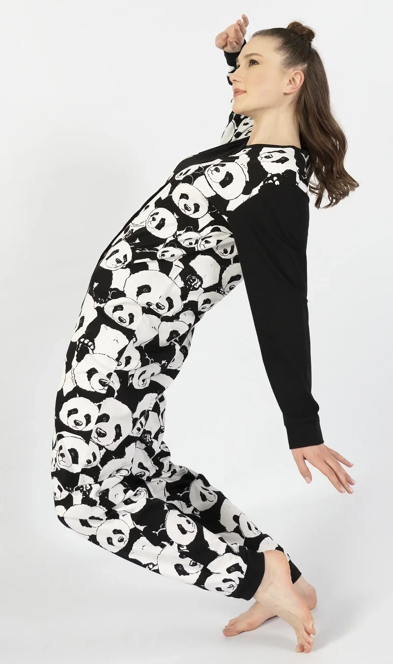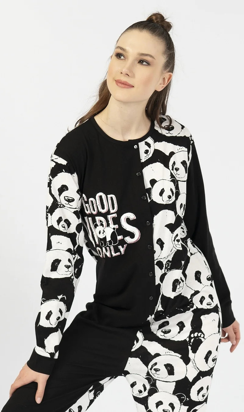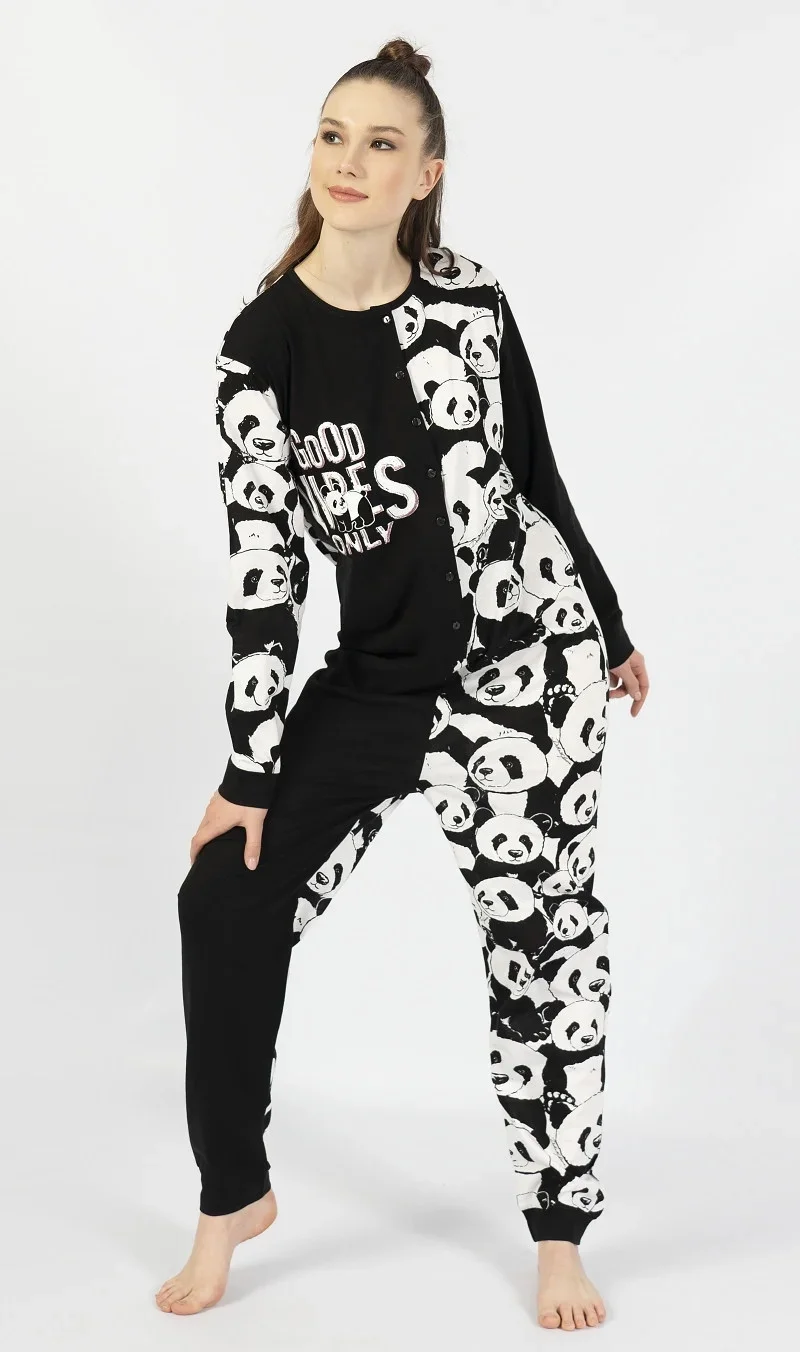 Dámský bavlněný overal Good vibes. Overal je celopropínací - z jedné strany zdobený obrázkem pandy a nápisem 'Good vibes only', z druhé strany celoplošným potiskem pandy. Dlouhé nohavice jsou ukončeny elastickými lemy. Bavlněný materiál je poddajný a příjemný na dotek.