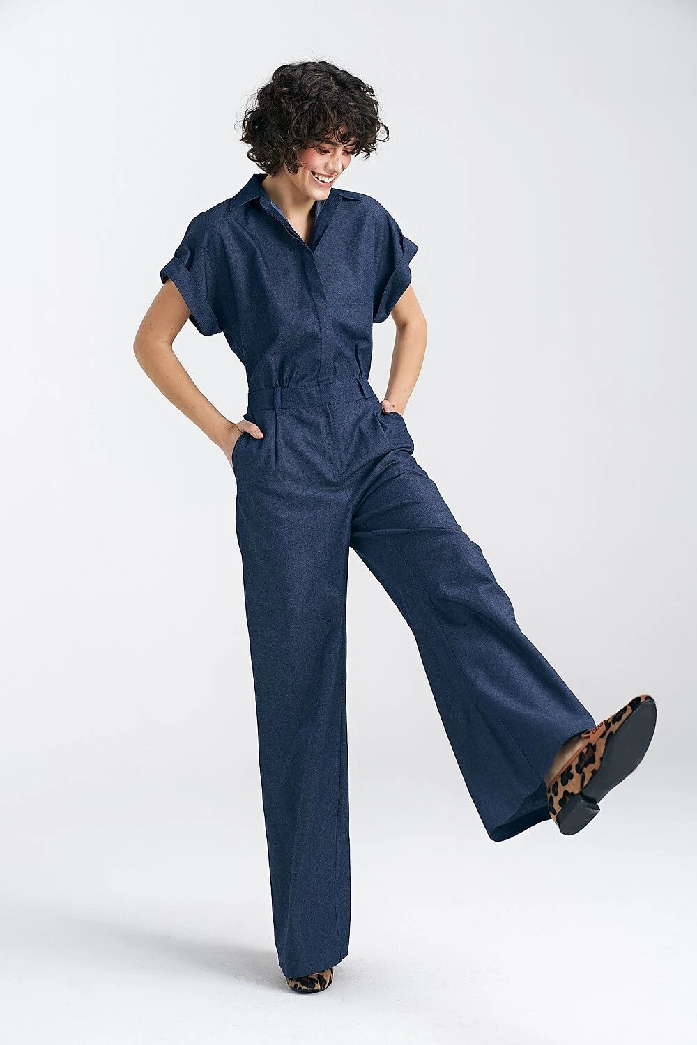 Krátké rukávy ve stylu kimona s manžetami dodávají overalu lehký a módní nádech. S