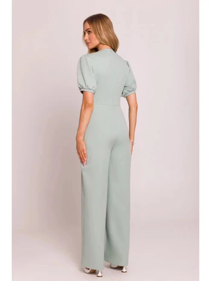 INFORMACE O PRODUKTU: tkaná látka jednodílný overal hluboký výstřih ve tvaru písmene V a v pase nařasený krátký rukáv zakončený manžetami široké nohavice se záhyby v pase skrytý zadní zip částečně podšitý naše modelka je vysoká 171 cm a nosí velikost S navrženo a vyrobeno v Polsku
