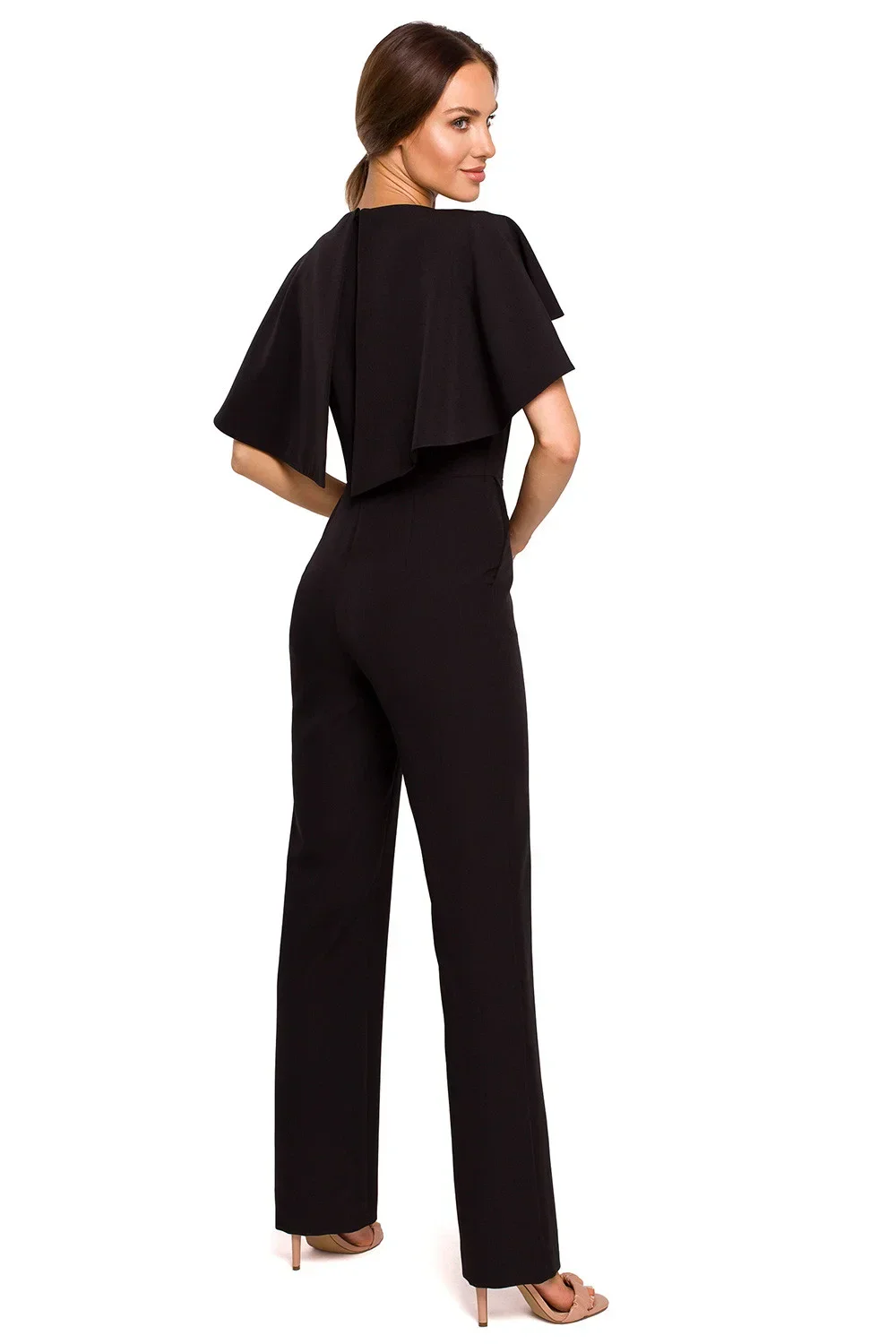 Síla je v detailech. Ženskou kreací pro zvláštní příležitosti jsou pohodlné kalhoty s výjimečně ženským zpracováním, pláštěnkou a řetízkem zdobícím hladkou přední část obleku. Oblek má skryté zapínání na zip.