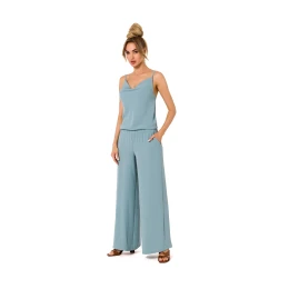 Kalhotový kostým s překládaným výstřihem a na tenkých ramínkách zavazovaných na zádech. Kombinéza s elastickým pasem a kapsami na bocích.