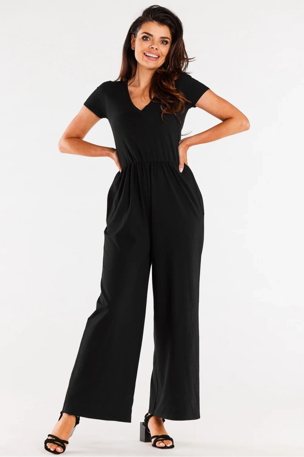 Široký overal z velmi příjemného a měkkého úpletu. Top s krátkými rukávy a výstřihem do V. Nařasený pas s gumičkou. Navrženo a ušito v Polsku.