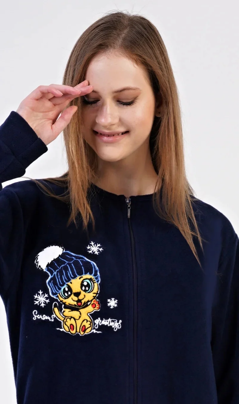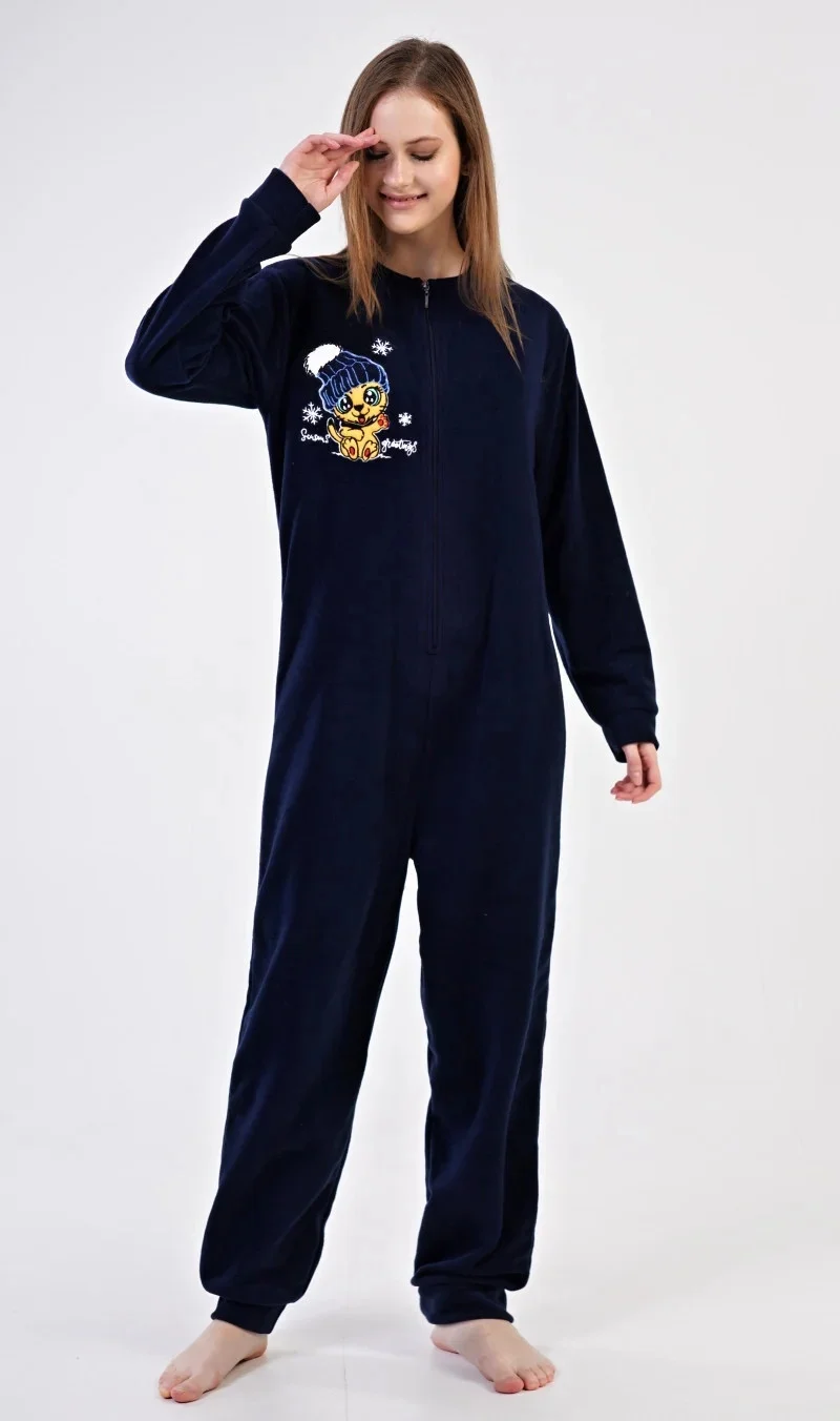 Dámský polarový overal Tygřík. Dámský overal na zip s našitou aplikací s motivem malého tygra, který má na sobě čepici s velkou bambulí. Na tmavě modrém podkladu je vyšitý nápis. Použitý materiál je hřejivý a poddajný na dotek.