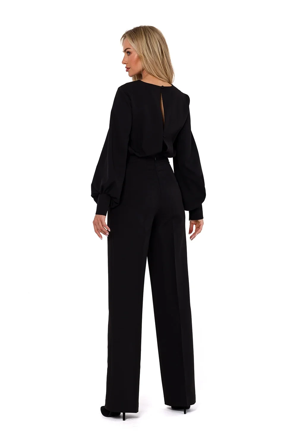Kombinéza s dlouhými buffovými rukávy a kulatým výstřihem. Zapínání na zip a knoflík. Nohavice kombinézy s okrajem rozšířeným ve spodní části. Bez podšívky. Navrženo a ušito v Polsku.